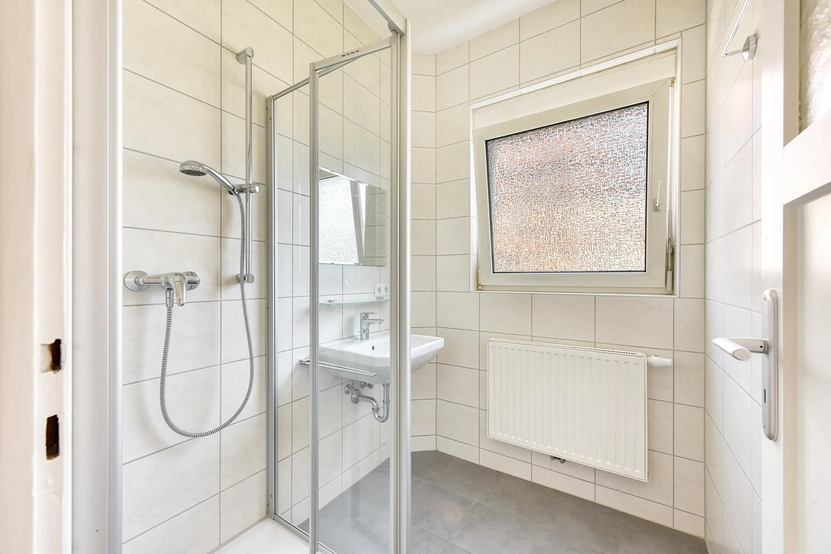 Das raumhoch geflieste Tageslicht-Badezimmer verfügt über eine Dusche, einen Spiegel sowie einen Waschtisch-Unterschrank.