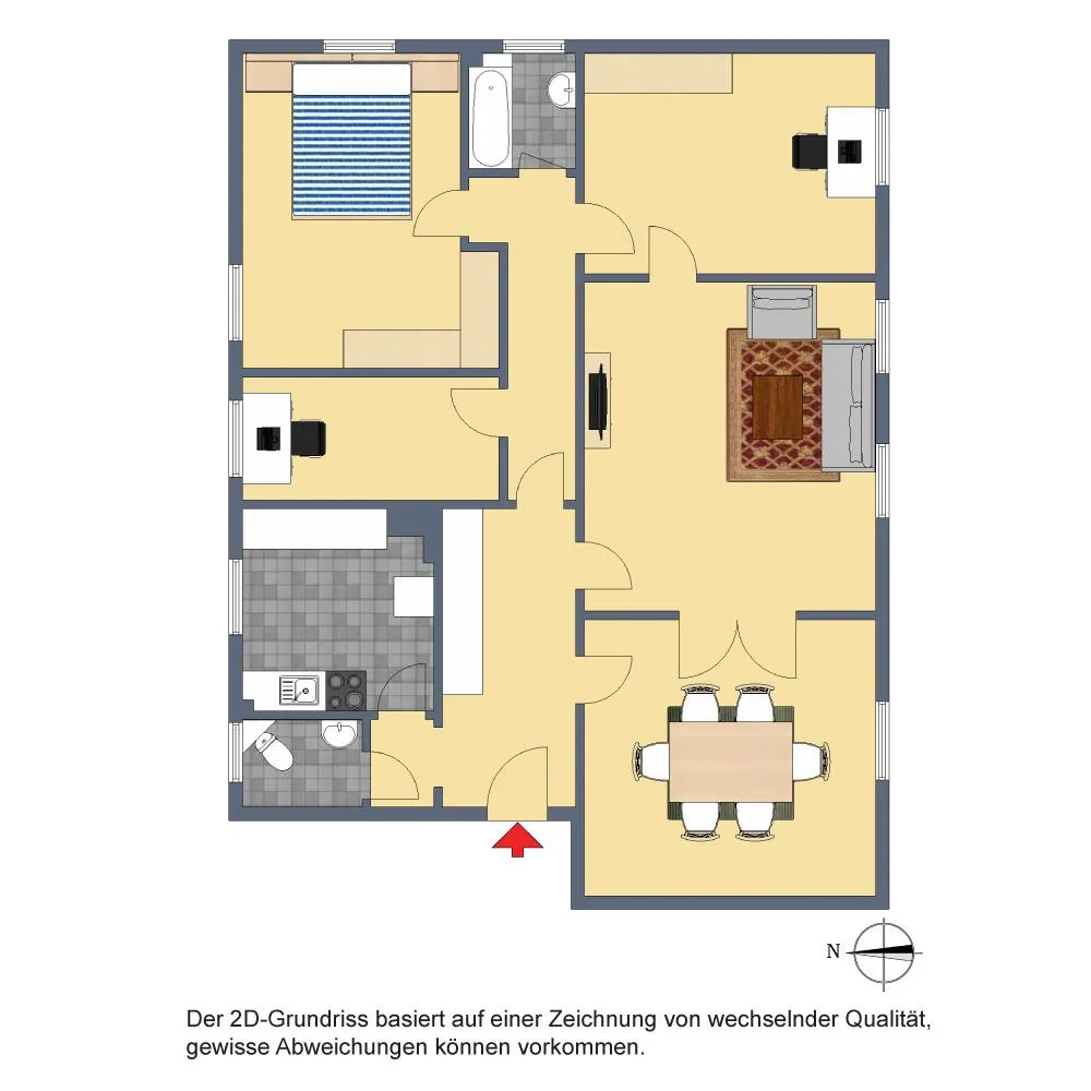 Das Wohn-, Ess- sowie das große Arbeitszimmer sind nach Süden, zum Garten ausgerichtet. Das Badezimmer ist nach Osten, zur Straße ausgerichtet. Die restlichen Räume sind nach Norden, zum Hauszugang ausgerichet.