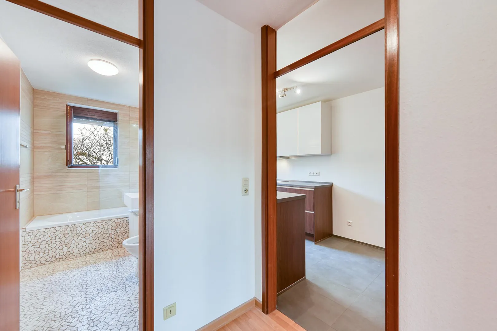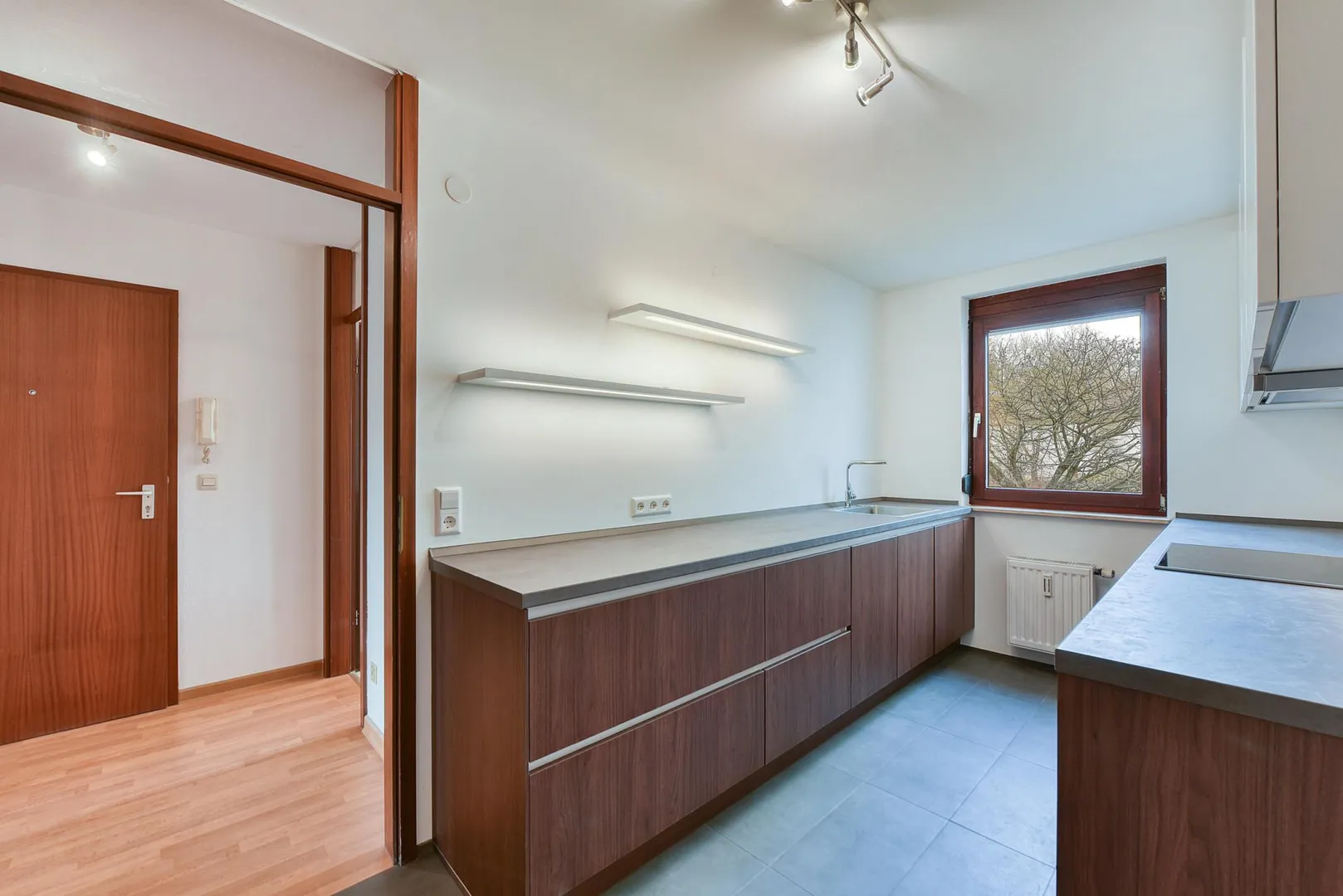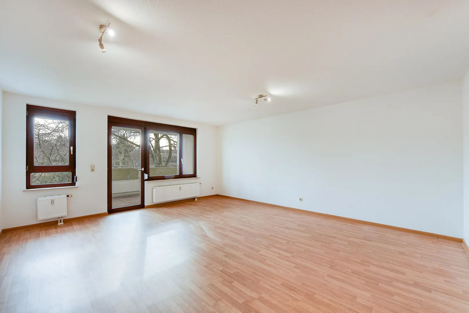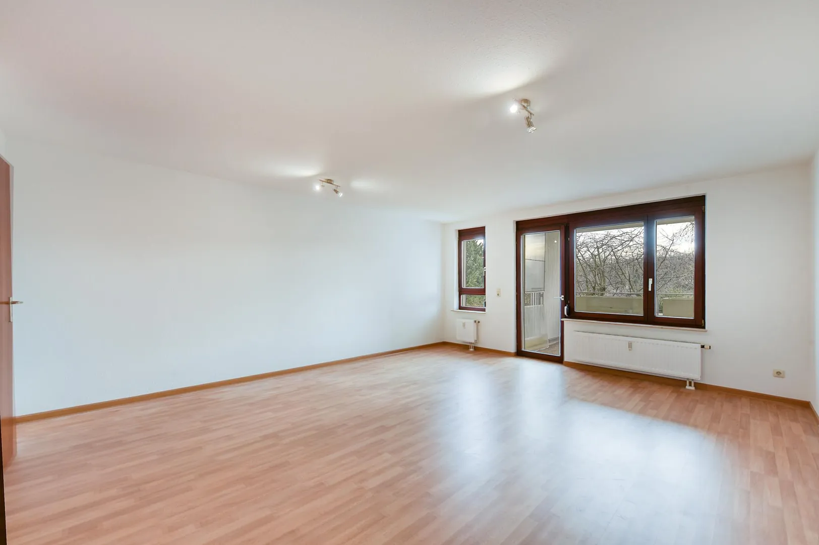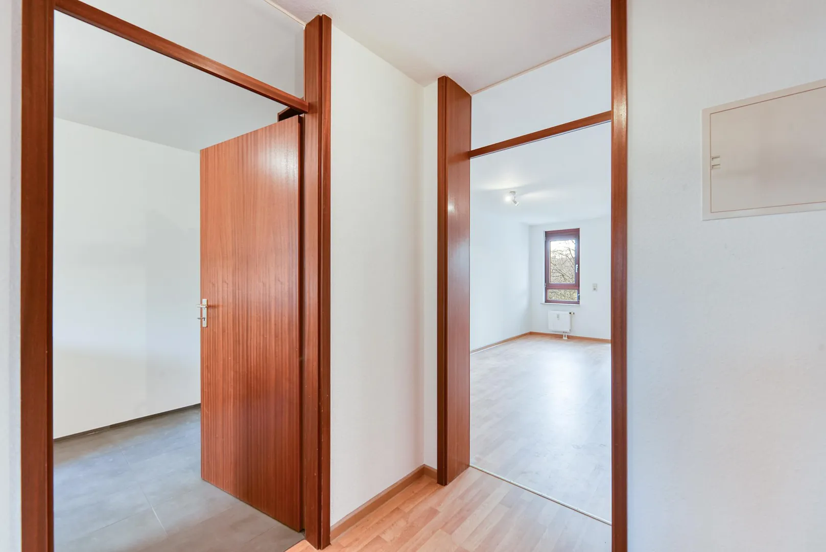 Im Flur und im Wohnzimmer sind Laminatböden verlegt.