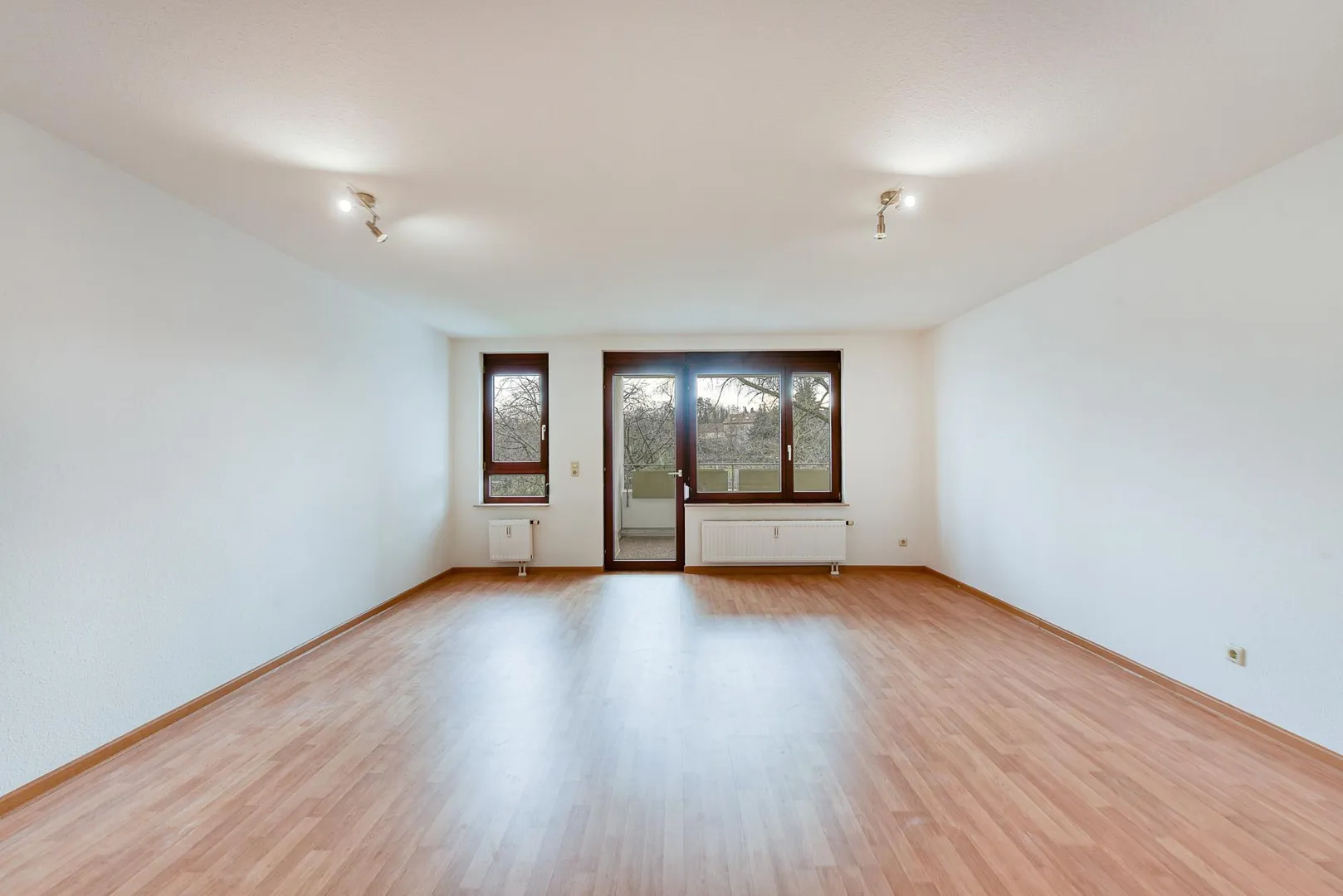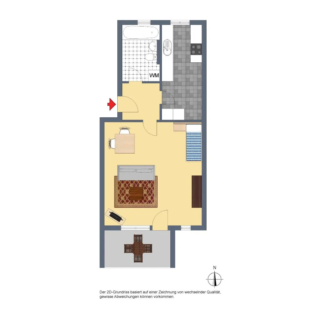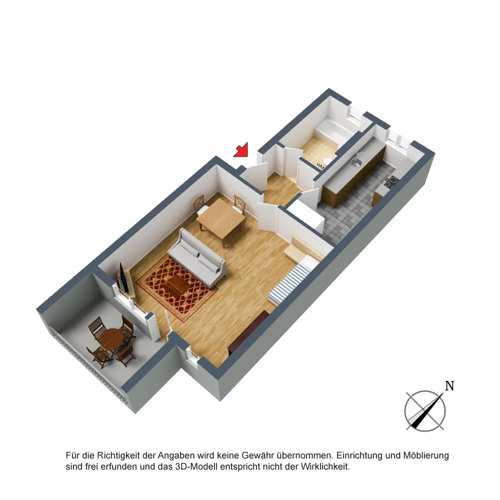 Der Grundriss ist sehr gut. Alle Räume sind direkt vom Flur begehbar. Der überdachte, ca. 7,4 m² große Süd-Balkon ist vom Wohnzimmer begehbar. Das Badezimmer verfügt über ein Fenster.