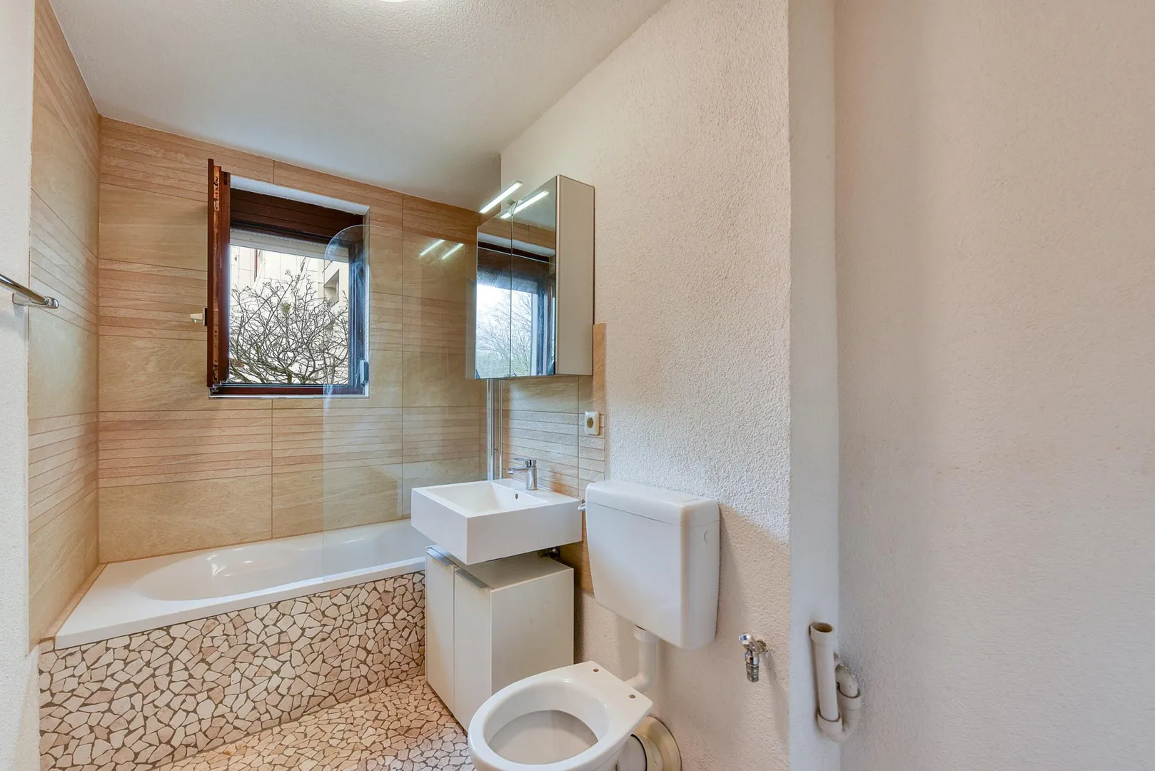 Das Tageslicht-Badezimmer wurde 2018 modernisiert. Es ist teilweise raumhoch gefliest und ist ausgestattet mit Fliesenboden, Badewanne mit Duschmöglichkeit, WC, Spiegelschrank sowie Waschmaschinenanschluss.