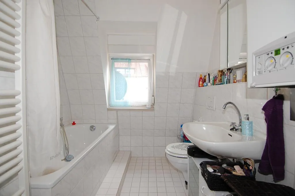 Das geflieste Badezimmer mit Fenster ist mit einer Badewanne, einem WC und einem Handtuchheizkörper ausgestattet.