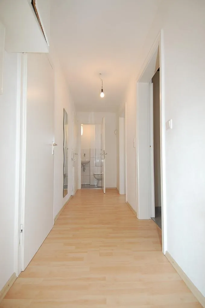 Der Flur verfügt über einen Laminatboden und gestrichenen Putz an den Wänden.