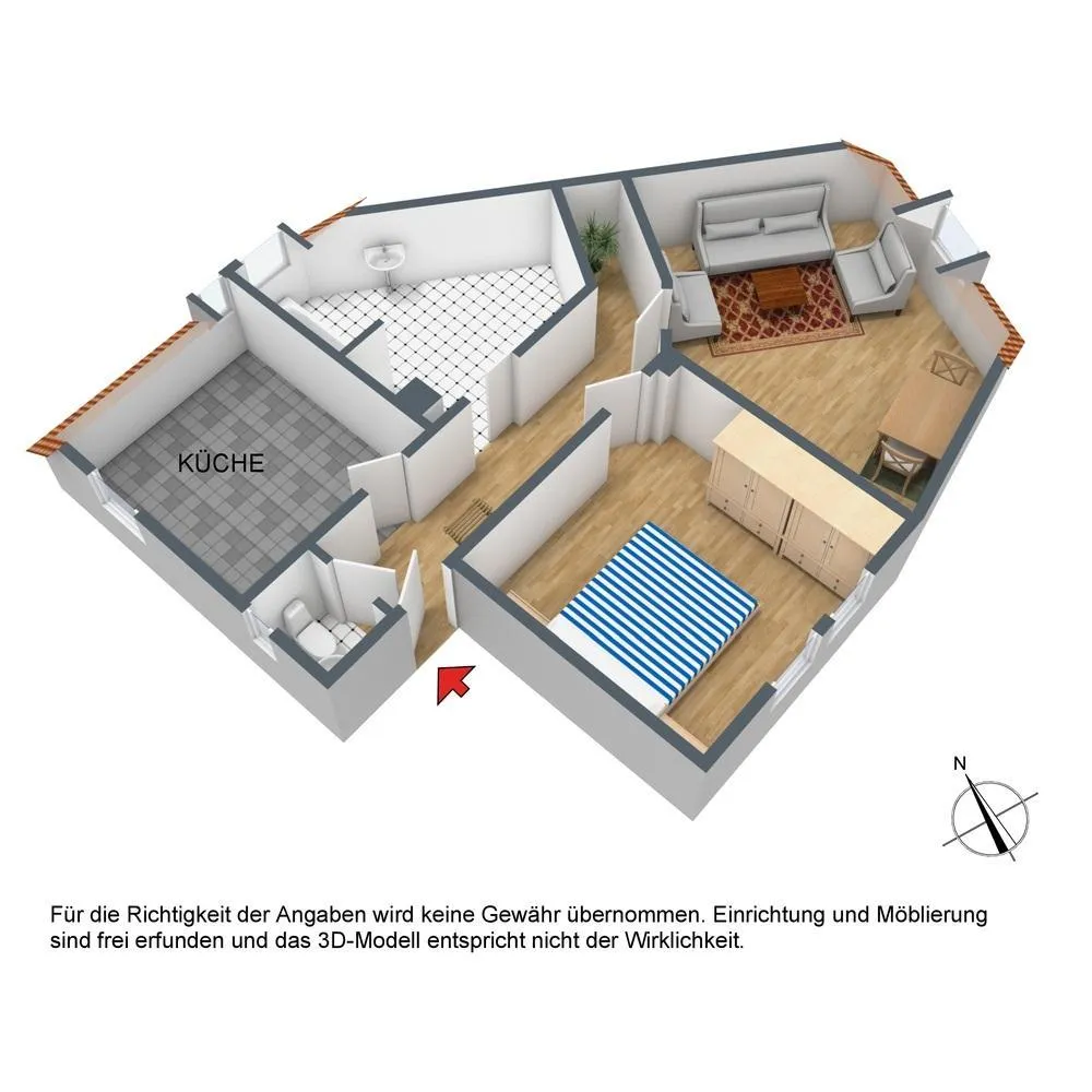Trotz sorgfältiger Prüfung der im Exposé gemachten Angaben, können wir für die Richtigkeit und Vollständigkeit der Angaben keine Haftung übernehmen. Bitte beachten Sie, dass die Immobilie auf den Bildern größer wirkt als sie in der Realität ist.