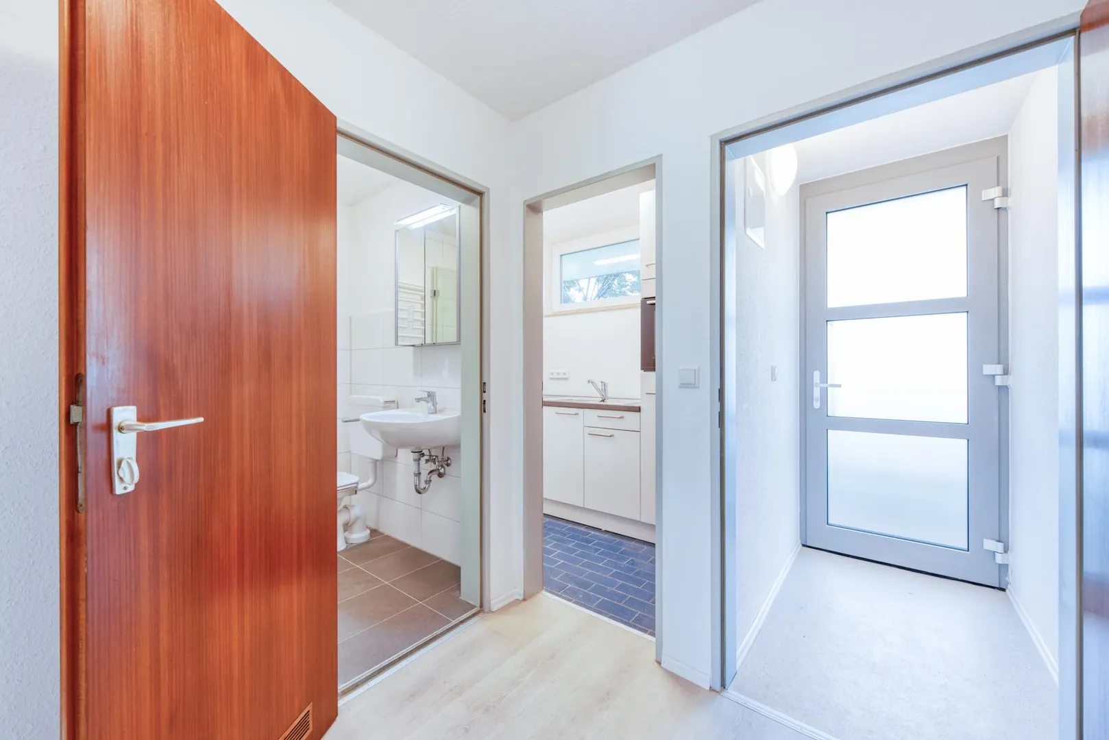 Die Wohnung wurde 2019 umfangreich modernisiert. Im Flur und im Zimmer wurden neue Vinyl-Design-Böden verlegt. Die Wände sind mit Raufasertapeten tapeziert und weiß gestrichen.