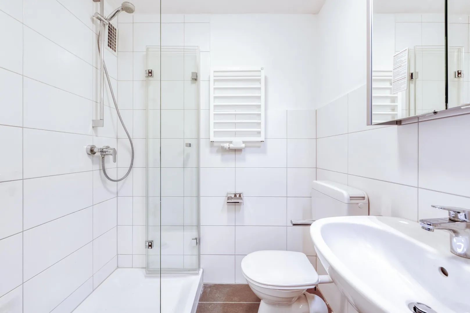 Das teilweise raumhoch und teilweise halbhoch geflieste Badezimmer ist mit einem Fliesenboden, einer Dusche, einem WC, einem Spiegelschrank mit Beleuchtung sowie einem Waschmaschinen-Anschluss ausgestattet.