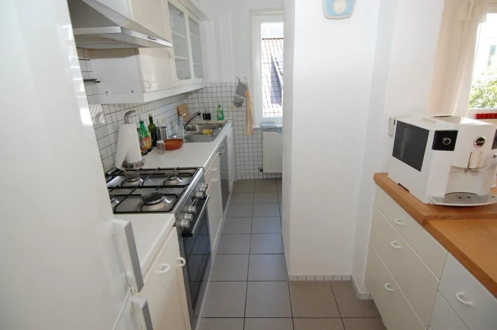 Die Küche ist mit einem Fliesenboden, einem Außenabzug und einer Einbauküche ausgestattet. Die Möblierung ist älter. Die E-Geräte sind "neuwertig".