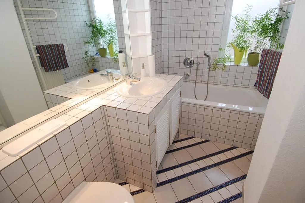 Das teilweise raumhoch geflieste Badezimmer mit Fenster ist ausgestattet mit Wanne, WC, Handtuchheizkörper, Einbauschrank und Holzdecke.