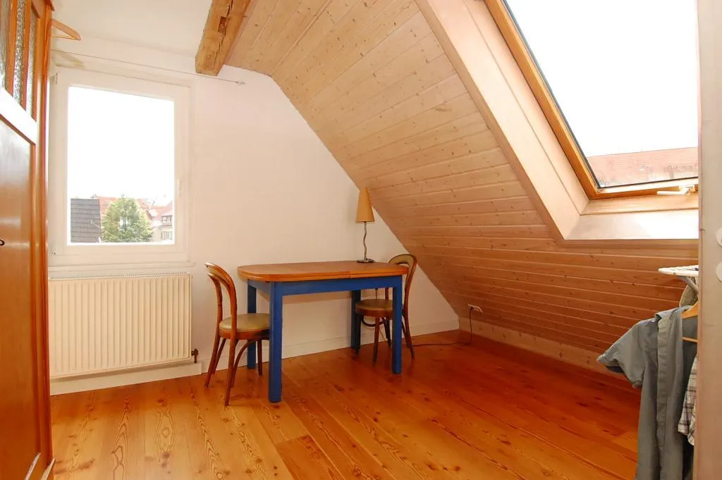 Vom Dachgeschoss geht es ins offene Studio. Das Studio ist mit Holzdielenböden und lasierten Holzdecken ausgestattet. Die Maximalhöhe beträgt ca. 2,08 Meter.
