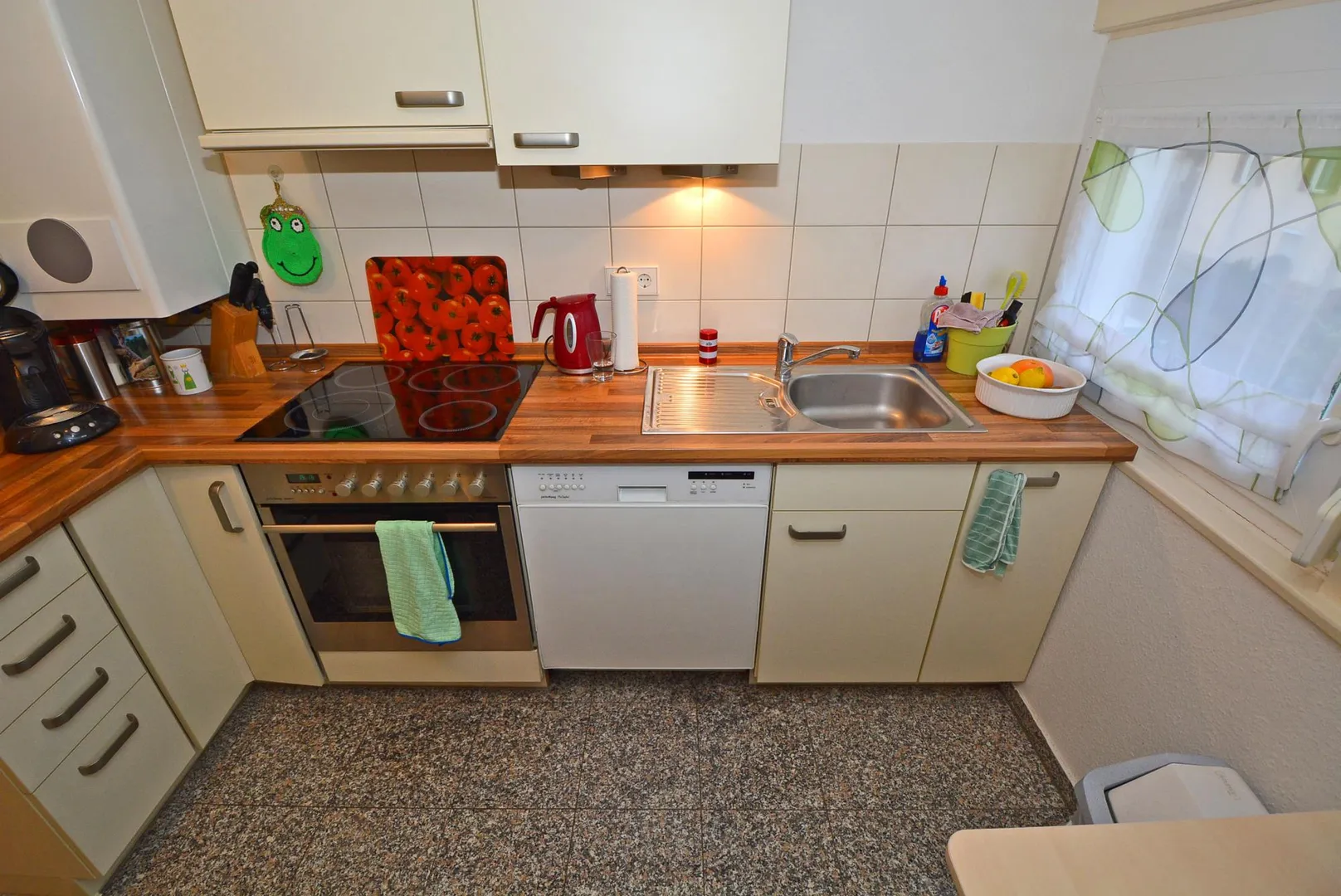 Die Küche ist mit einer modernen Küchenzeile ausgestattet. Diese verfügt über Cerankochfeld & Backofen, Dunstabzug, Spüle sowie Ober- und Unterschränke.