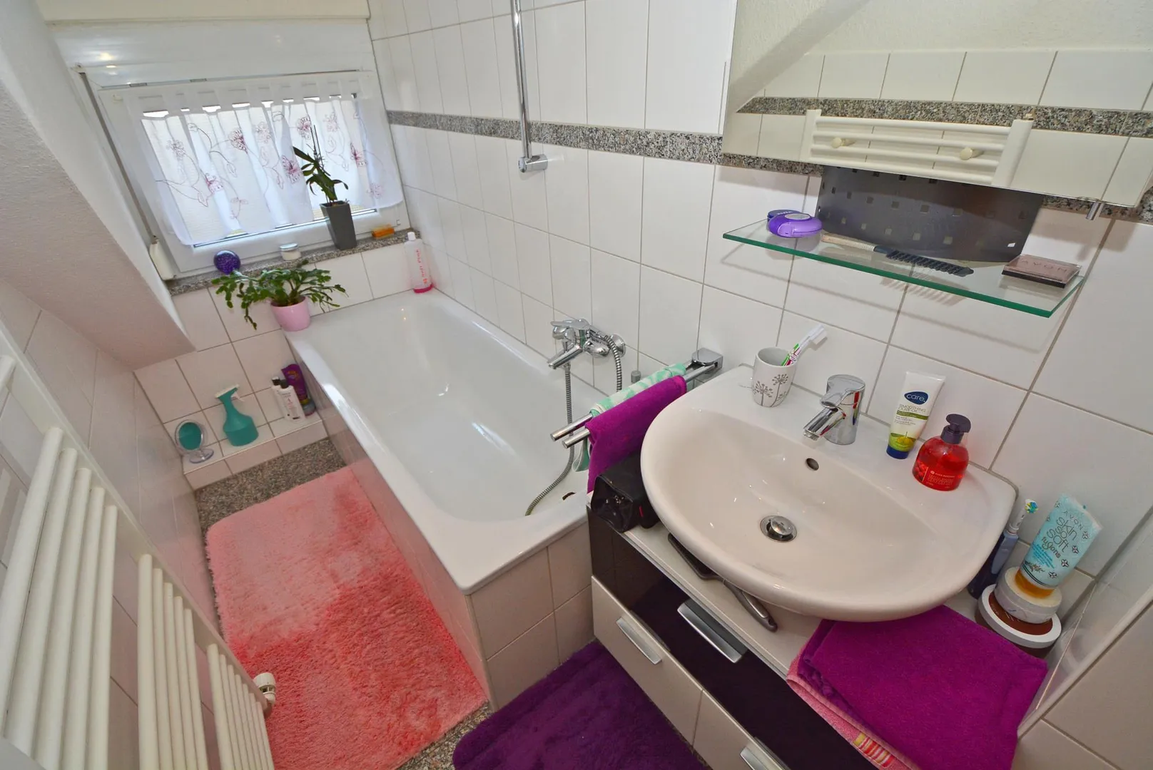 Das kompakte Bad ist raumhoch weiß gefliest und mit Badewanne, Waschbecken, Handtuchhalter-Heizkörper und Fenster ausgestattet.