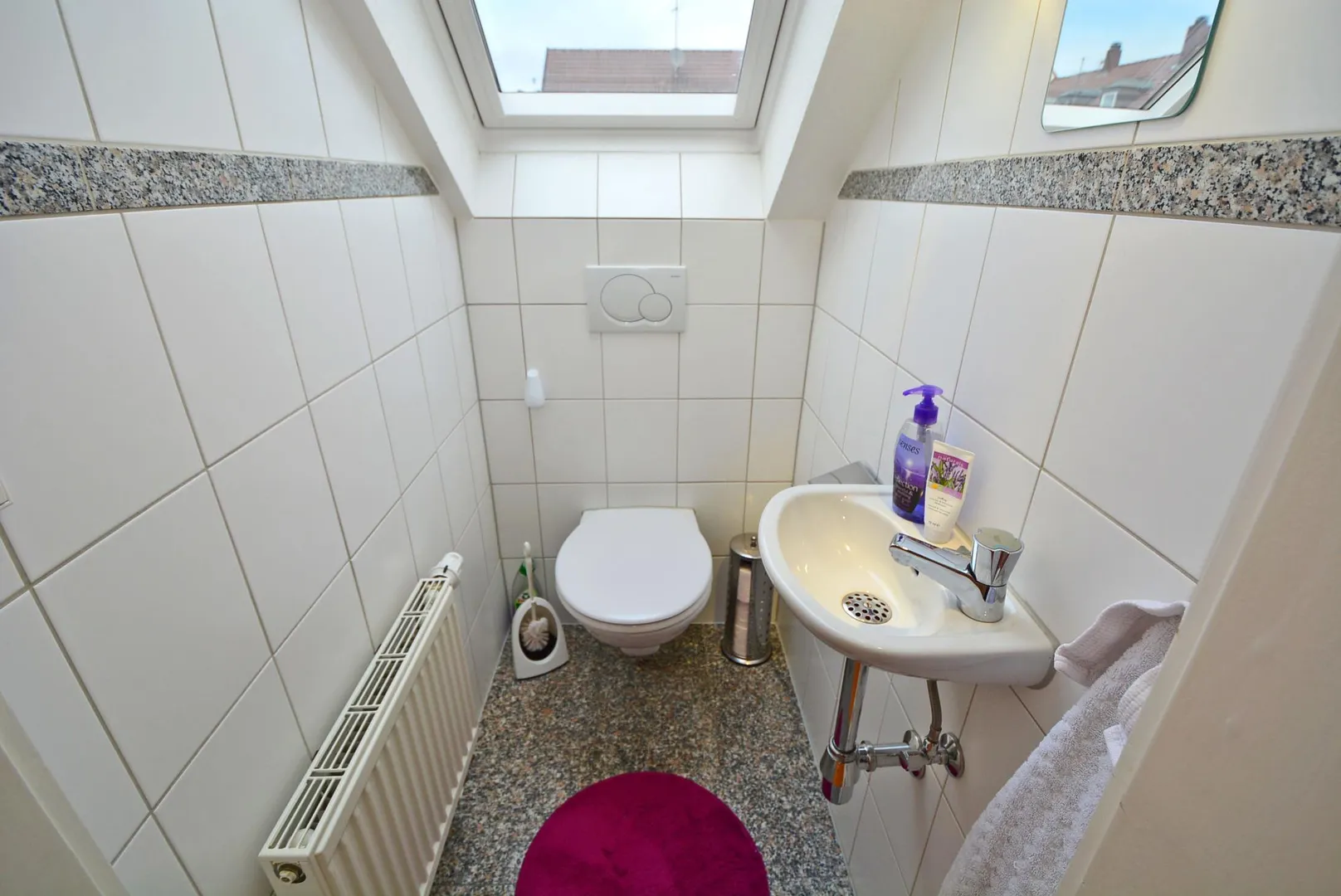 Direkt nebenan befindet sich das separate WC mit Waschbecken und Fenster.