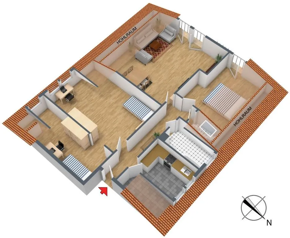 Bitte beachten Sie, dass durch die Dachschrägen weniger Stellfläche für große Möbel vorhanden ist.