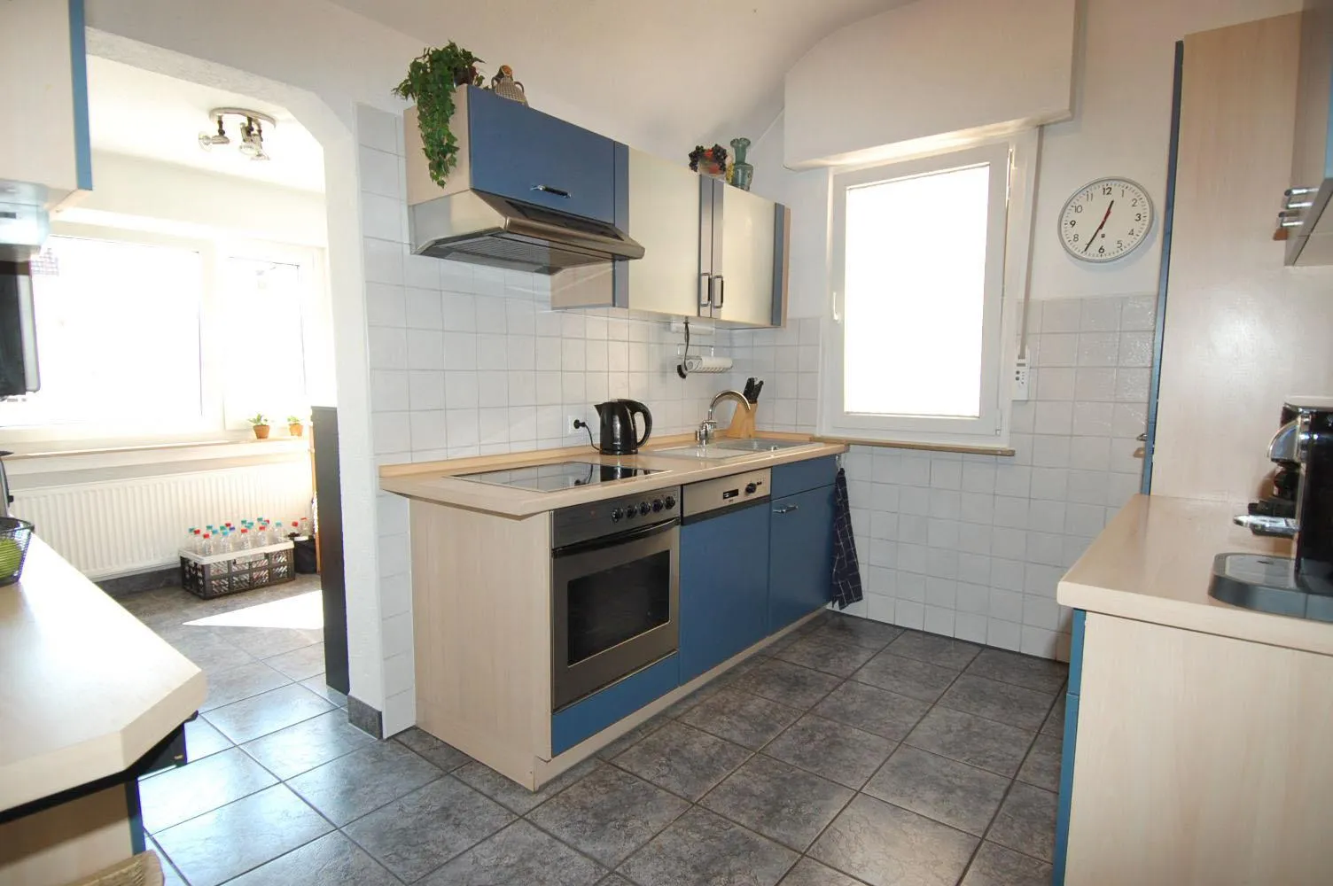 - Küche mit Einbauküche, u.a. ausgestattet mit Kühl-/Gefrierschrank, Cerankochfeld und Backofen, Umluft-Dunstabzug, Spülmaschine sowie ausreichend Stauraum in Ober- und Unterschränken