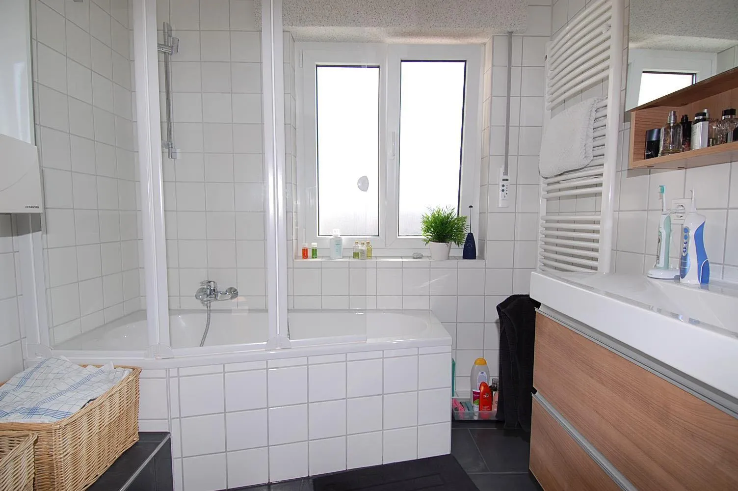 - freundlich modernisiertes Bad: raumhoch weiß gefliest, u.a. ausgestattet mit großen, anthrazitfarbenen Bodenfliesen, Wanne mit Duschmöglichkeit, Handtuchhalter-Heizkörper, übergroßes Waschbecken mit Unterbau, Spiegelschrank und Fenster
