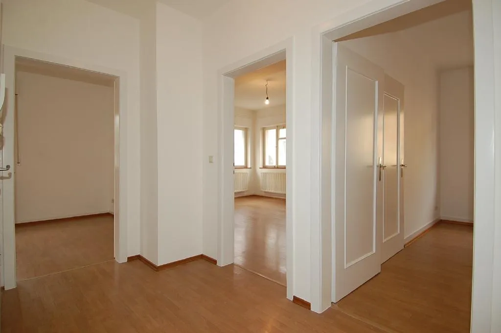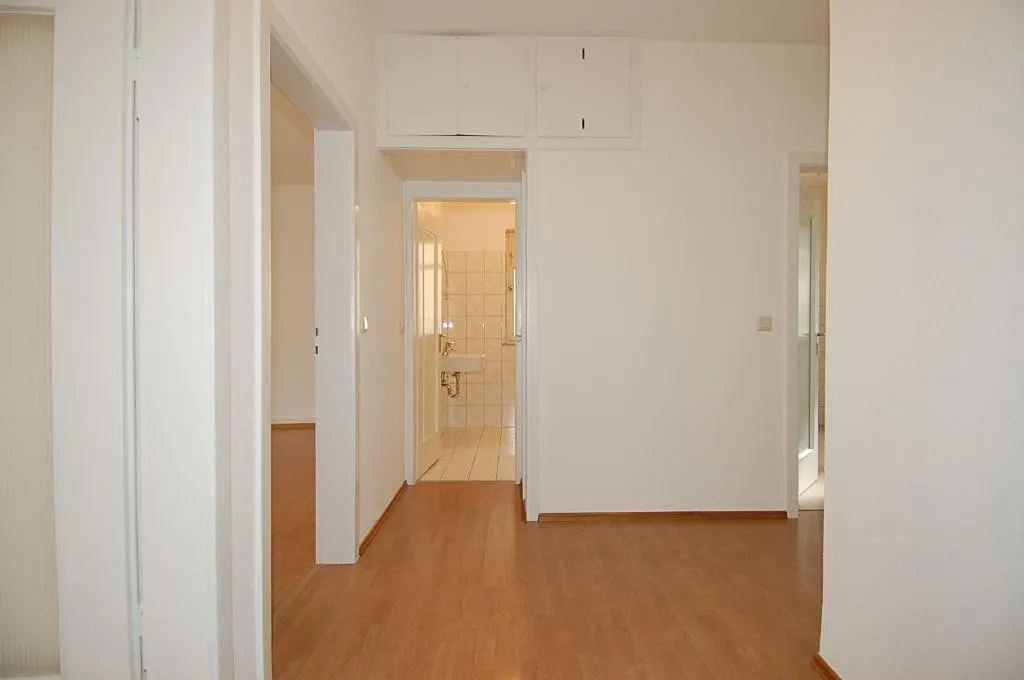 In den Zimmern und im Flur ist Laminat verlegt. Die Wände sind mit Raufaser tapeziert und gestrichen.