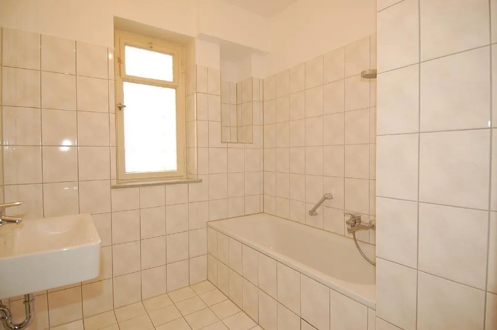 Das Tageslicht-Bad wurde vor ca. 15 Jahren modernisiert. Es ist halbhoch gefliest und mit einem Fliesenboden, einem Fenster, einer Wanne, einem Handtuch-Heizkörper und einem Waschbecken ausgestattet.