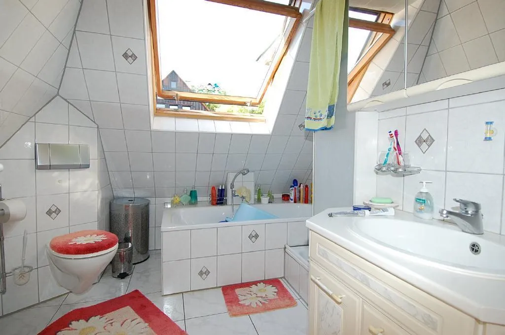 Im Dachgeschoss befinden sich das Tageslichtbad mit Badewanne, das Schlafzimmer und das Kinderzimmer. Über eine Treppe kommen Sie vom Kinderzimmer auf die ausgebaute Bühne. Der Flur und das Tageslichtbad sind weiß gefliest. Das Schlafzimmer, das Kinderzimmer und das sich darüber befindende Bühnenzimmer sind mit einem Laminatbodenbelag ausgestattet.