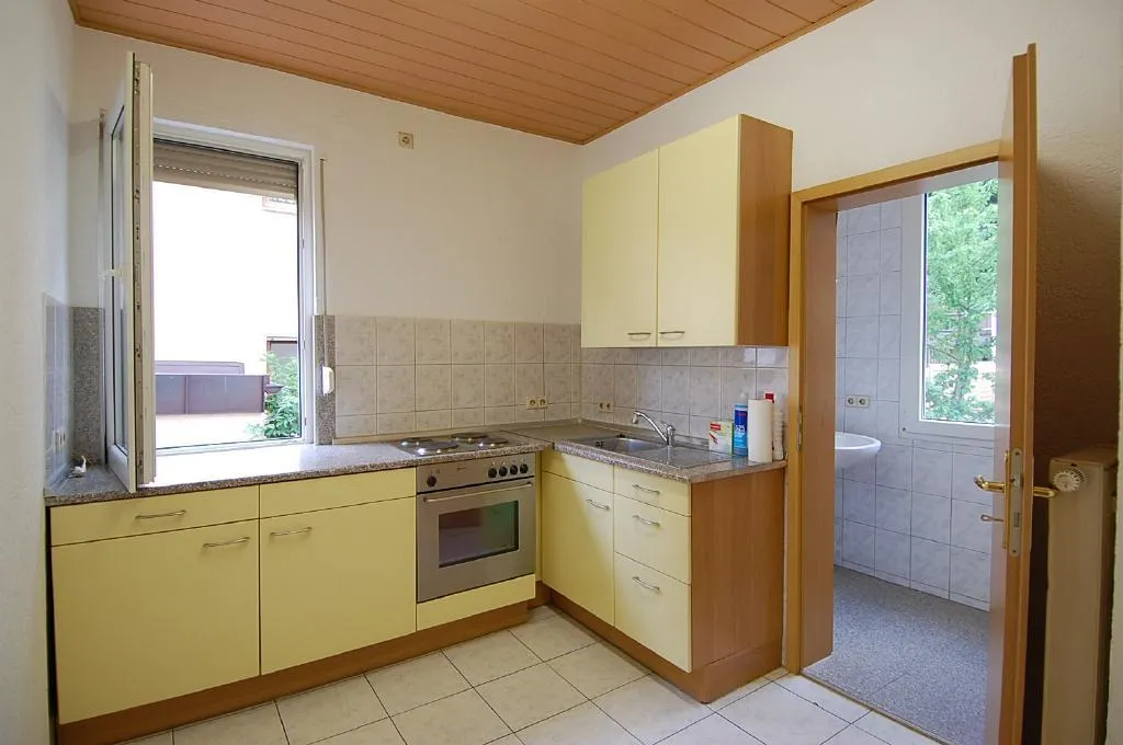 Die Küche ist mit einer einfachen Einbauküche ausgestattet. Die Einbauküche verfügt über einen Kühlschrank mit Gefrierfach, einen Herd mit Backofen sowie Unter- und Oberschränke. Die E-Geräte sind funktionsfähig. Für die künftige Funktionsfähigkeit der E-Geräte übernimmt der Vermieter keine Haftung. Die Einbauküche verfügt über keine Spülmaschine. Der Küchenboden ist gefliest.