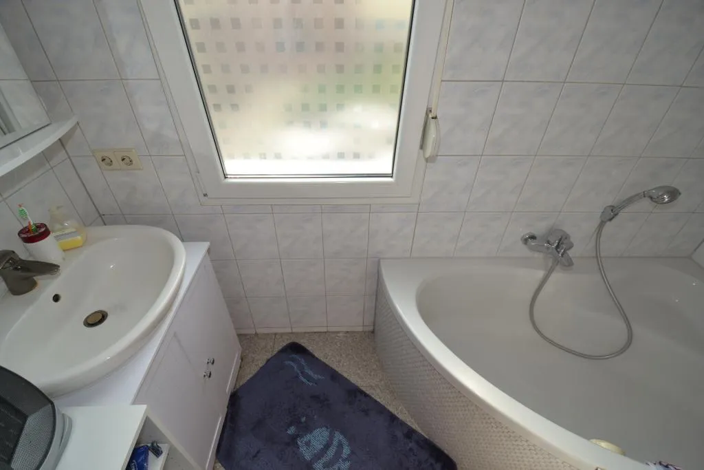 Das raumhoch geflieste Tageslichtbad ist ausgestattet mit einer Badewanne, einem Fliesenboden, einem Waschbeckenunterschrank und einem Handtuchheizkörper (Spiegelschrank kann evtl. vom Vormieter übernommen werden).