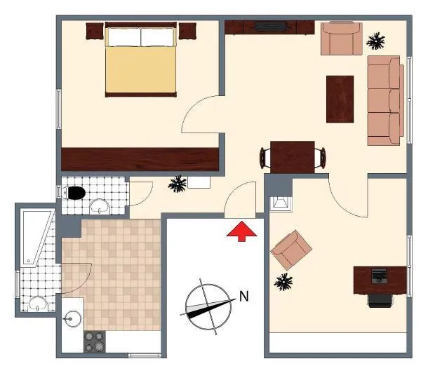 Die Wohnung eignet sich für maximal 2 Personen, da der Grundriss einfach ist. Das Schlafzimmer und das Arbeitszimmer sind über das Wohnzimmer begehbar. Das Badezimmer mit Fenster ist über die Küche begehbar. Die Wohnung verfügt über keinen Balkon. Das geflieste WC mit Fenster ist separat.