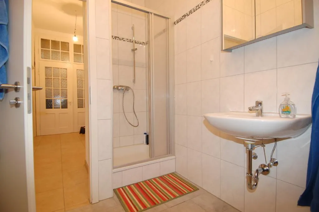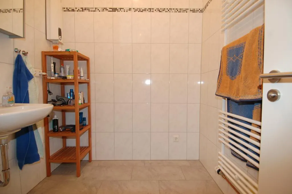 Das Badezimmer ist raumhoch gefliest und mit einer Dusche und einem Handtuchheizkörper ausgestattet.