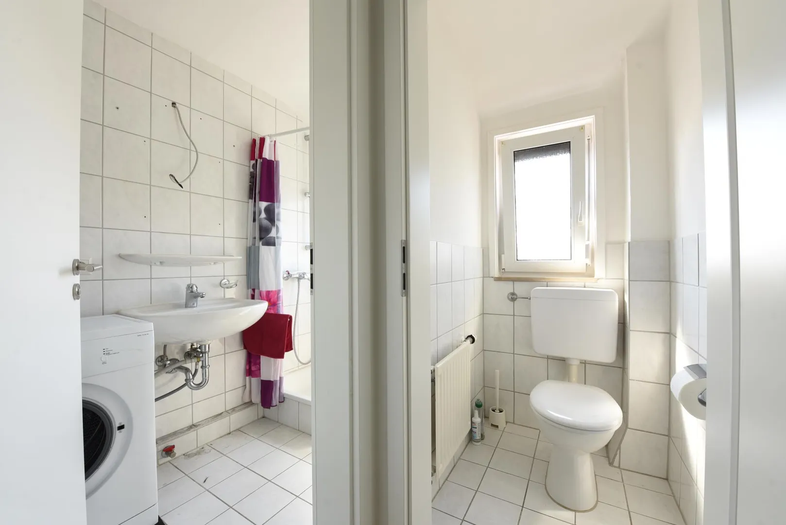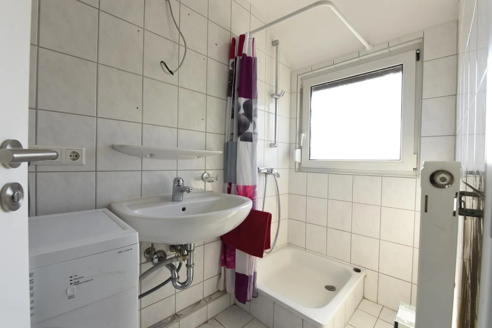 Das raumhoch geflieste Badezimmer mit Fenster ist ausgestattet mit einem Fliesenboden, einer Dusche sowie einem Waschmaschinenanschluss. Vom Vormieter können der Waschtischunterschrank, der Spiegelschrank sowie die Waschmaschine übernommen werden.