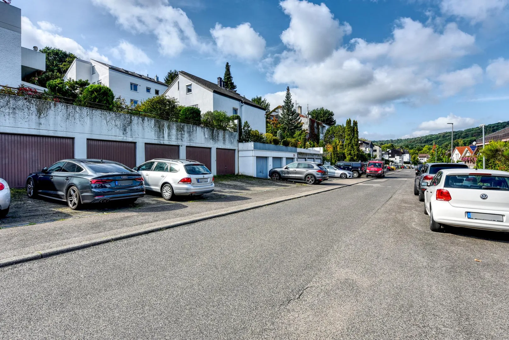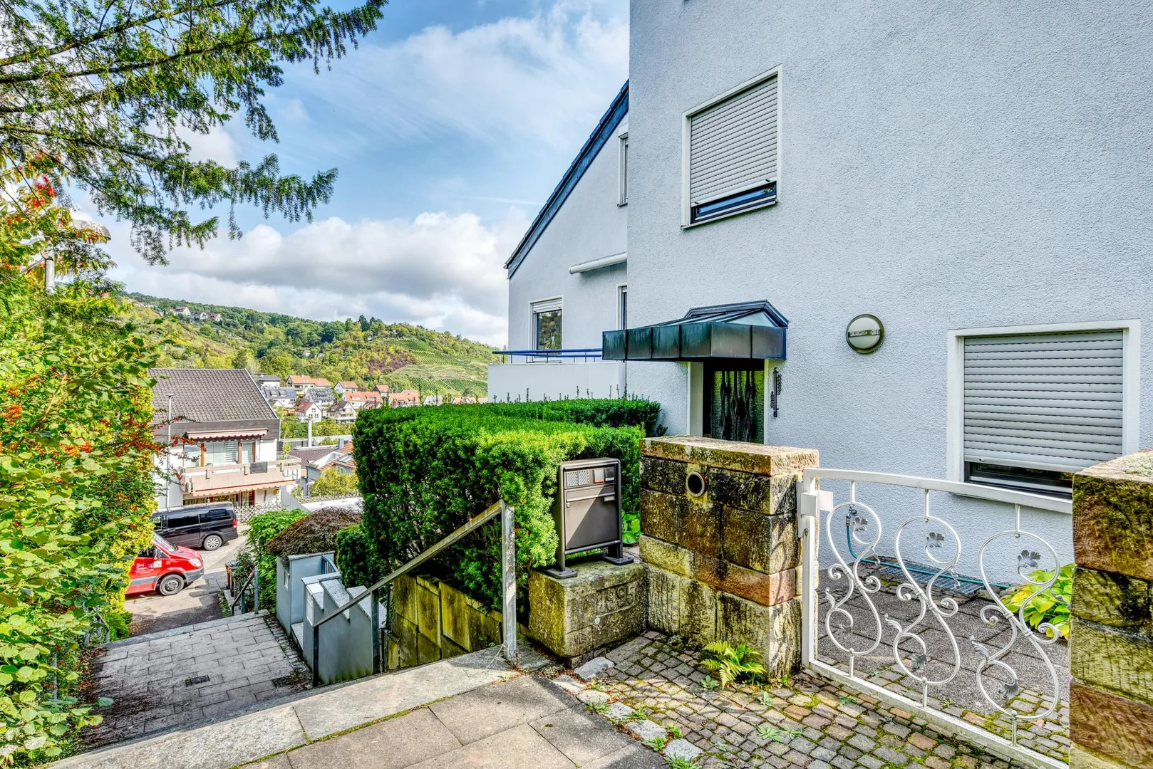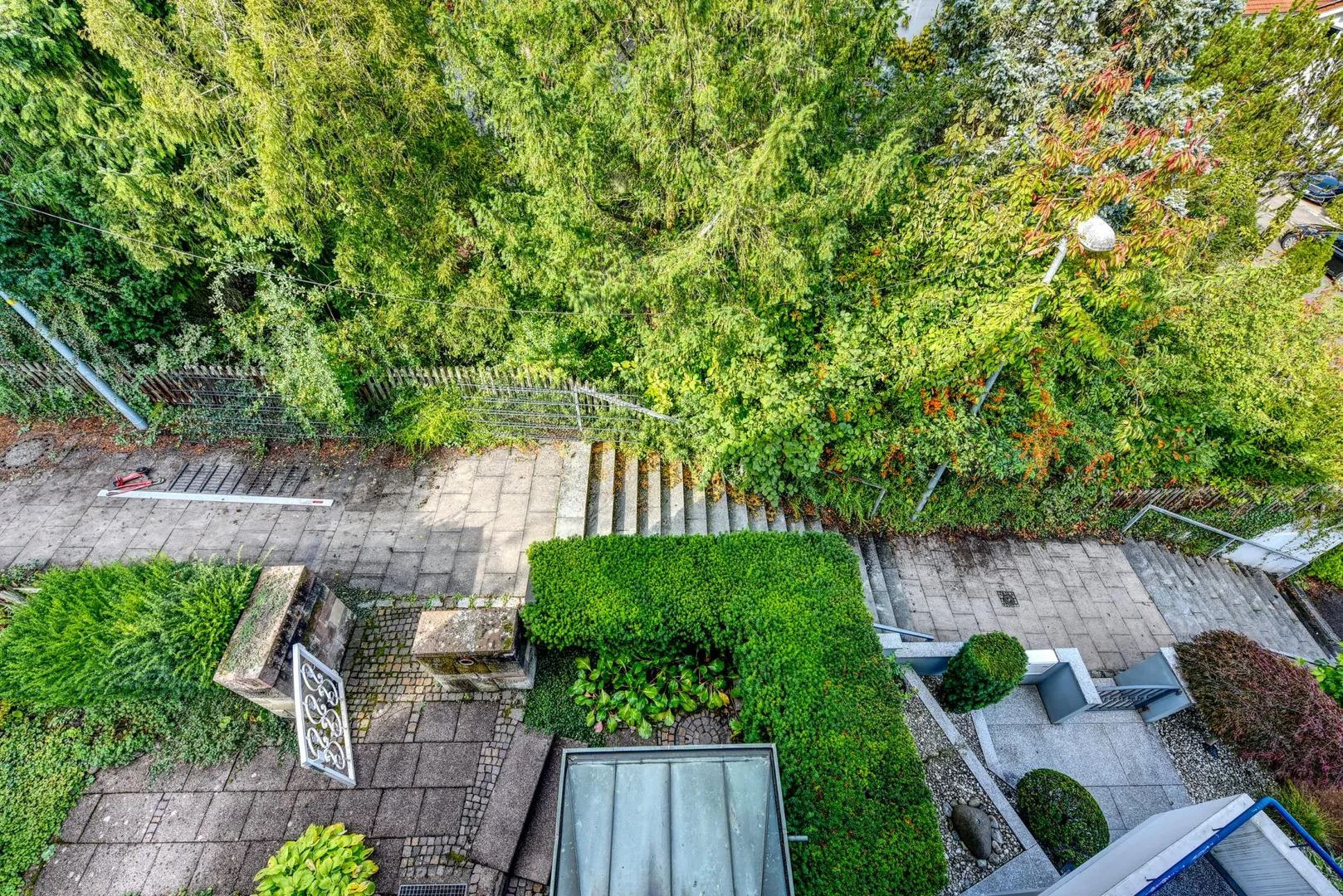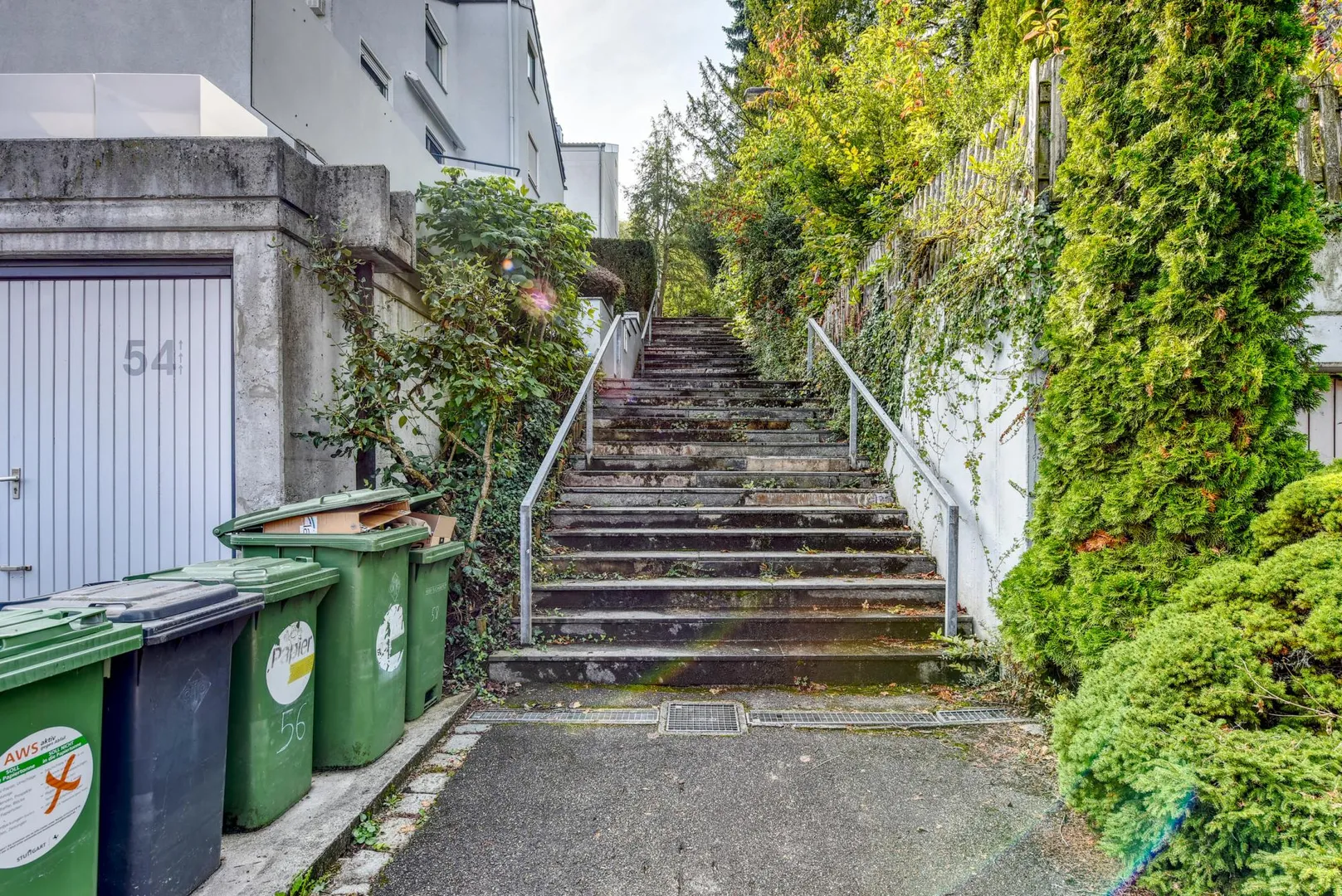 Das Grundstück befindet sich in Nord-Hanglage und ist über eine Staffel (32 Stufen) erreichbar. Das Grundstück ist rechteckig. Der Terrassenbereich ist nach Süd-Osten ausgerichtet. Es ist im Terrassenbereich relativ eben und im "Gartenbereich" nach Süd-Westen ansteigend. Die Einzel-Garage mit einem Kfz-Stellplatz davor befindet sich an der Straße.