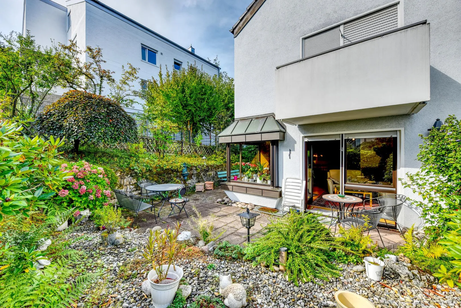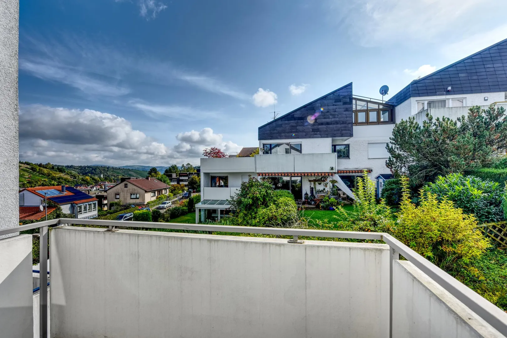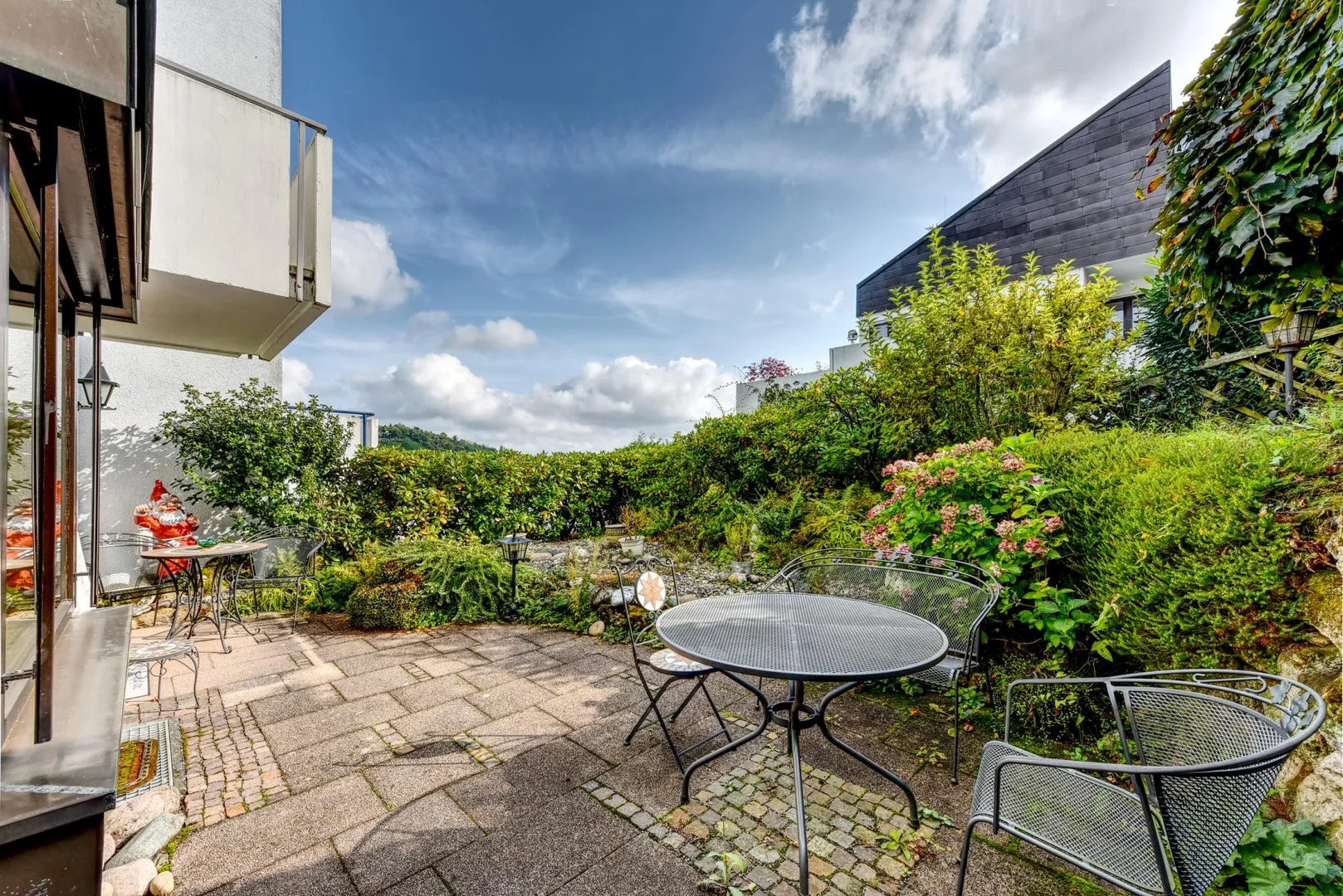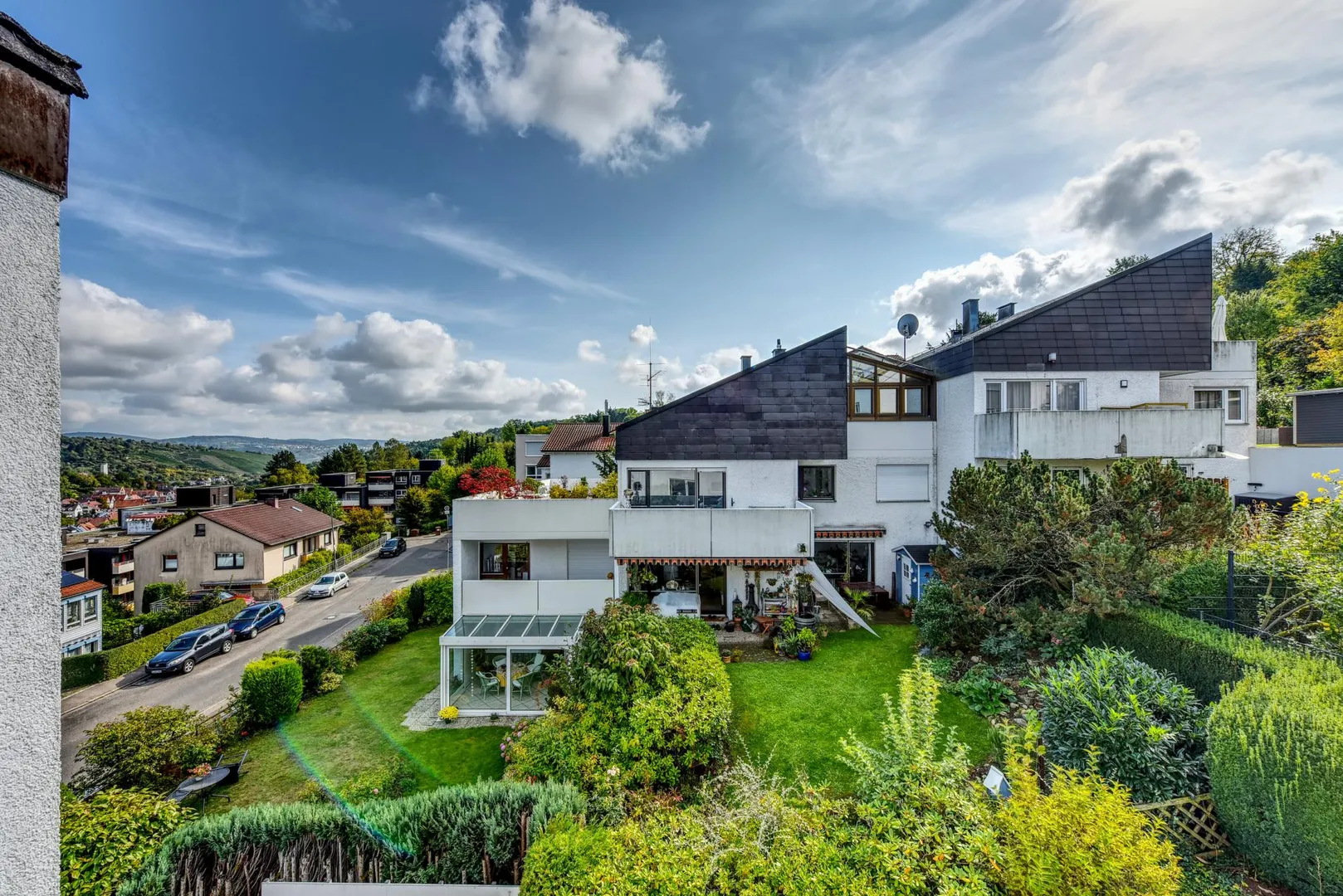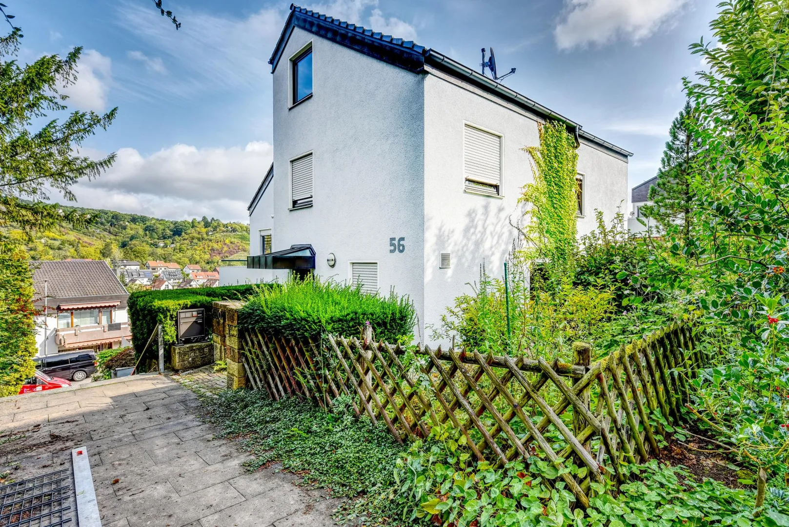 Das Grundstück befindet sich in Nord-Hanglage und ist über eine Staffel (32 Stufen) erreichbar. Das Grundstück ist rechteckig. Der Terrassenbereich ist nach Süd-Osten ausgerichtet. Es ist im Terrassenbereich relativ eben und im "Gartenbereich" nach Süd-Westen ansteigend. Die Einzel-Garage mit einem Kfz-Stellplatz davor befindet sich an der Straße.