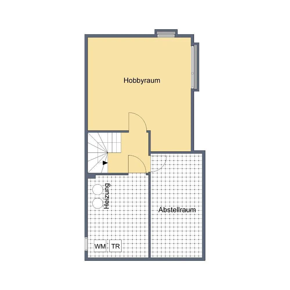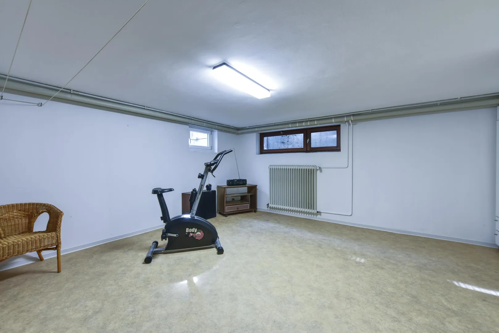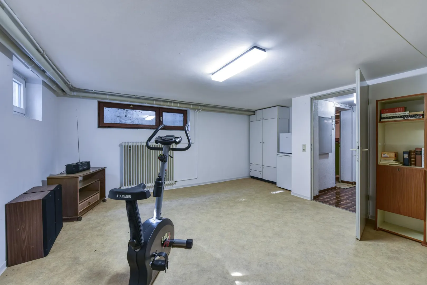 Die Kellerfläche beträgt ca. 47 m². Im Kellergeschoss gibt es einen beheizten, ca. 22 m² großen Hobbyraum mit zwei Lichtschächten, einen Abstellraum sowie einen Technikraum (Heizung und Waschmaschine). Die Raumhöhen betragen knapp über 2 Meter.