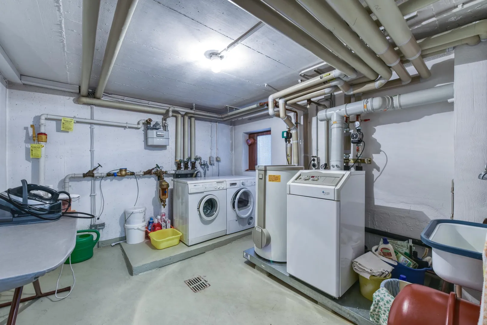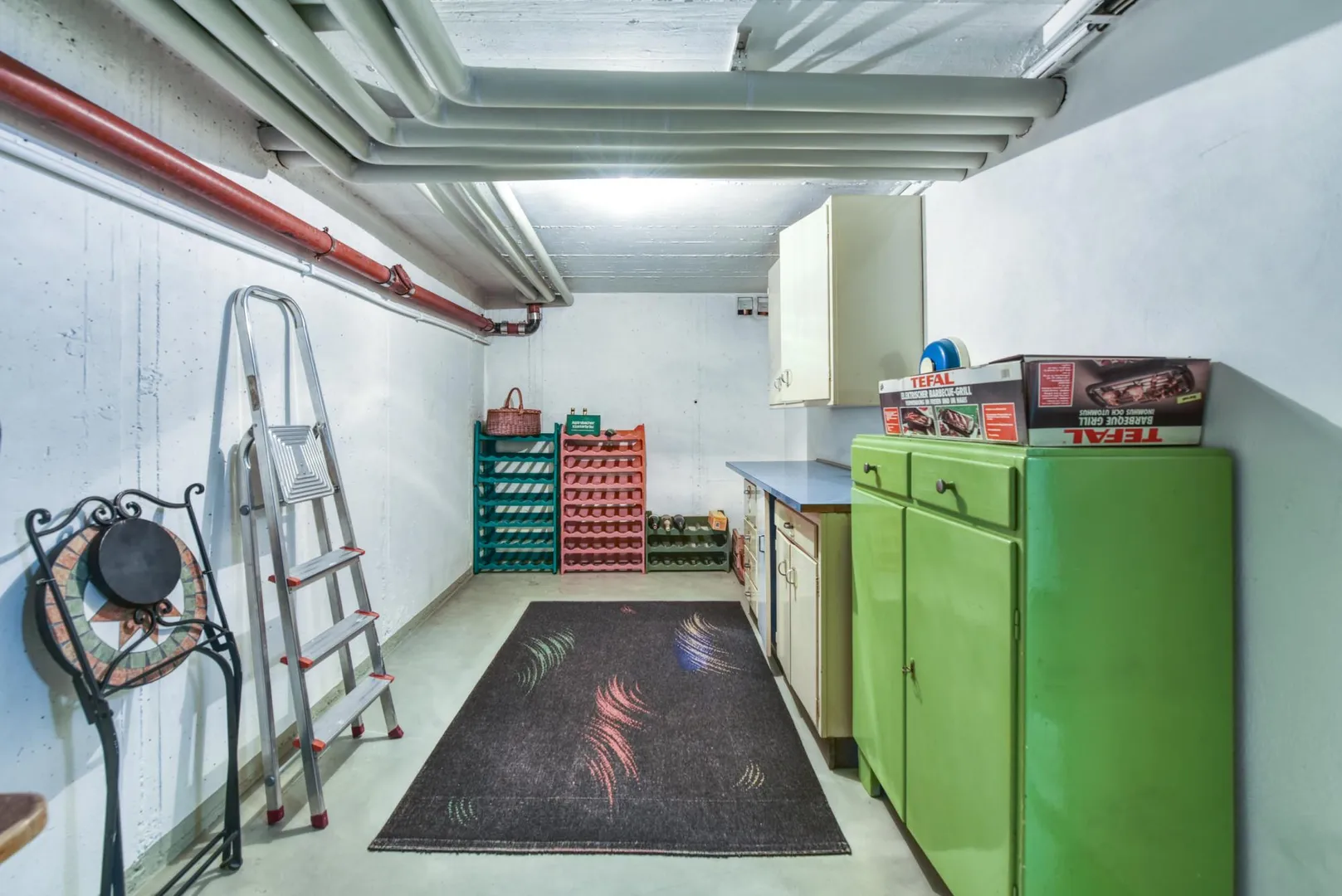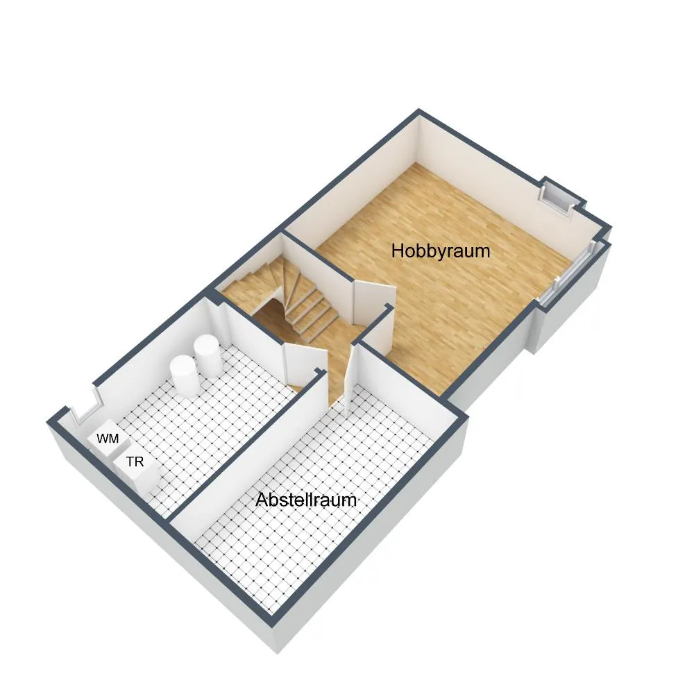Die Kellerfläche beträgt ca. 47 m². Im Kellergeschoss gibt es einen beheizten, ca. 22 m² großen Hobbyraum mit zwei Lichtschächten, einen Abstellraum sowie einen Technikraum (Heizung und Waschmaschine). Die Raumhöhen betragen knapp über 2 Meter.