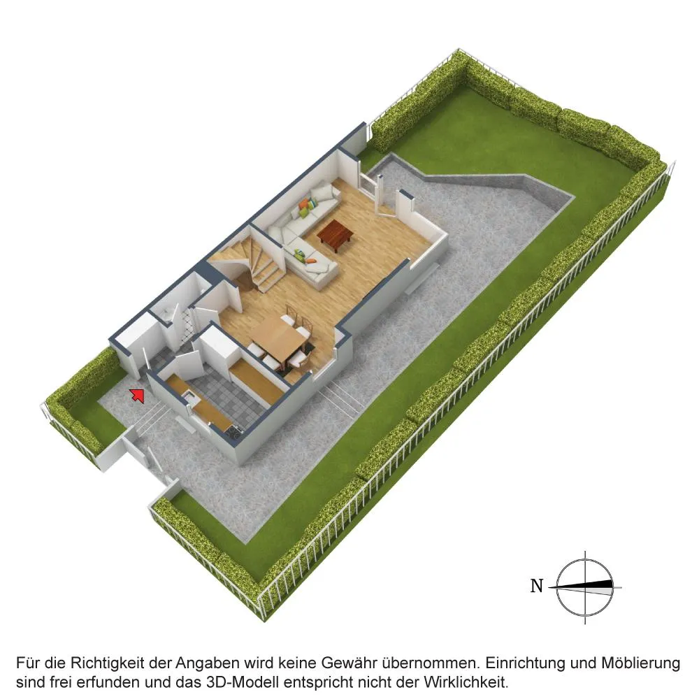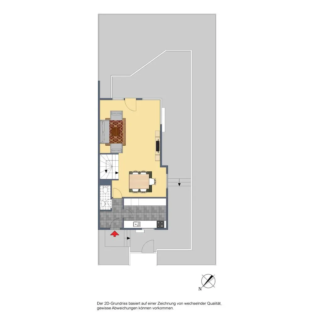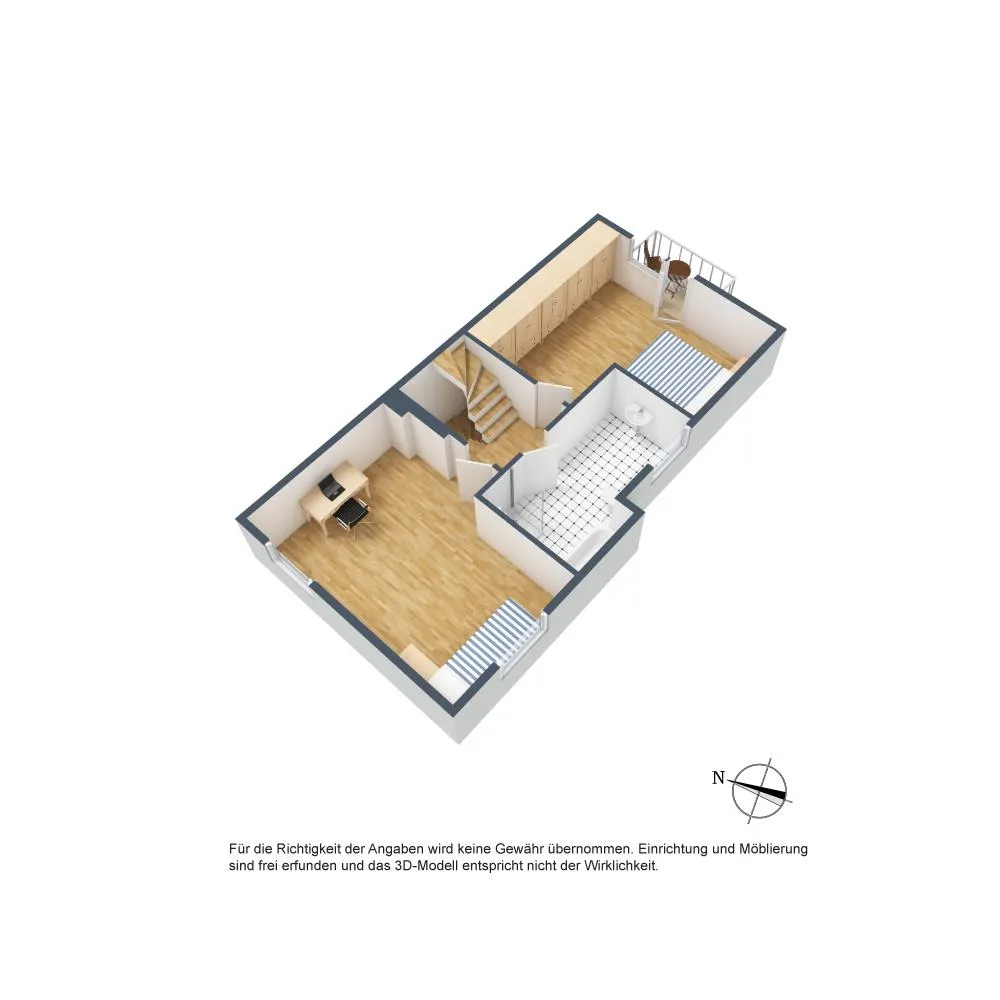 Das Erdgeschoss verfügt über ca. 46 m² Wohnfläche, einen Wohn-Essbereich, eine Küche sowie ein separates WC. Die Terrasse ist ca. 15 m² groß. Die Raumhöhen betragen ca. 2,35 Meter.