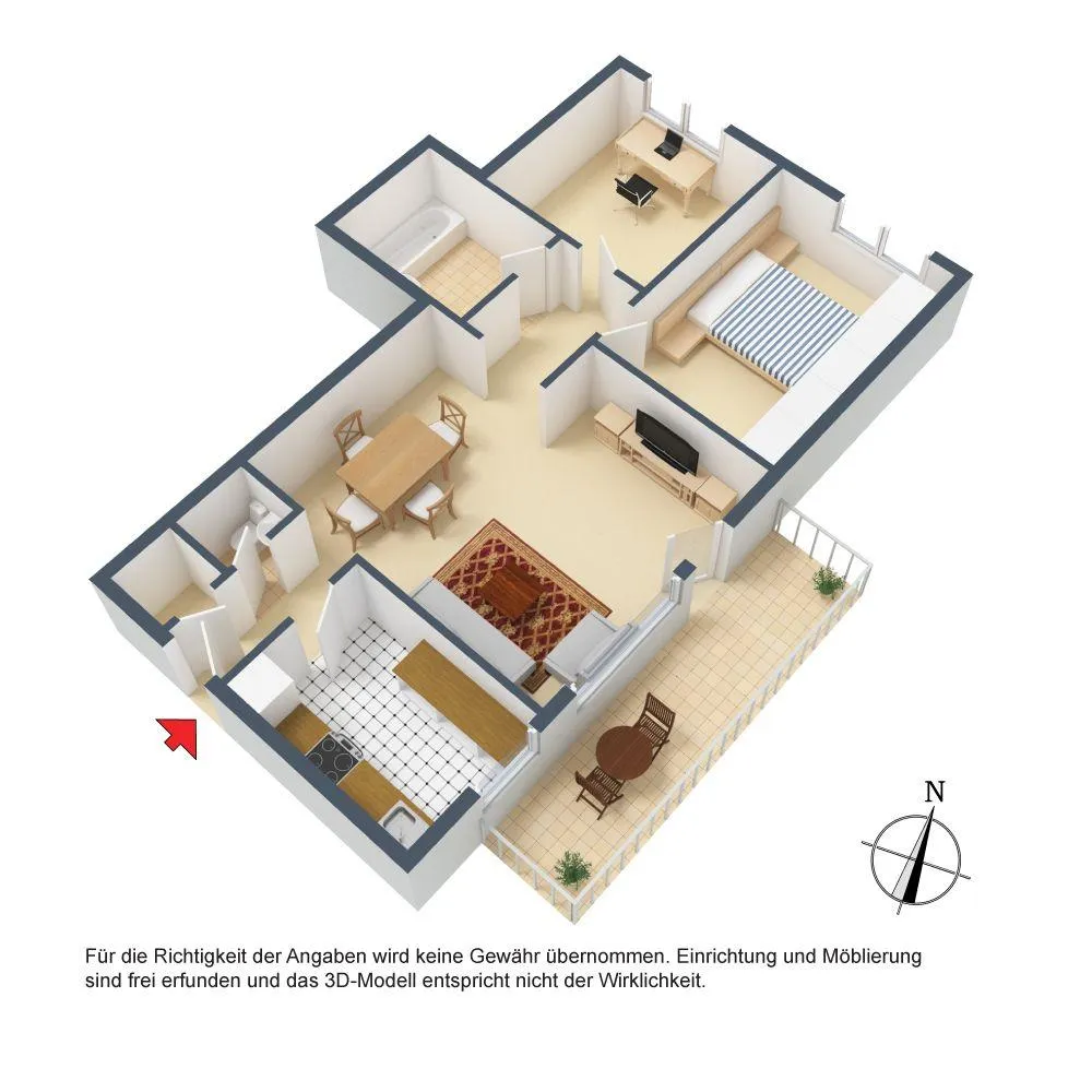 Der Wohnbereich mit dem Balkon sowie die Küche sind nach Osten ausgerichtet. Das Schlafzimmer sowie das Arbeitszimmer sind nach Norden ausgerichtet.