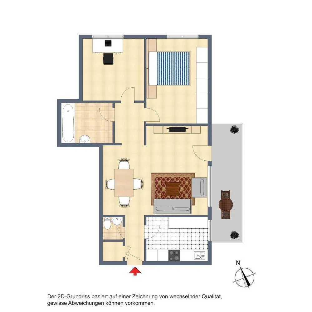 Der Grundriss ist offen gestaltet. Über den offenen Wohn-/Essbereich sind das Schlafzimmer, das Arbeitszimmer sowie das Badezimmer begehbar. Der ca. 9,6 m² große und überdachte Ost-Balkon ist über den Wohnbereich begehbar. Das Badezimmer ist innenliegend. Das innenliegende WC ist separat. In der Wohnung befindet sich ein Abstellraum.