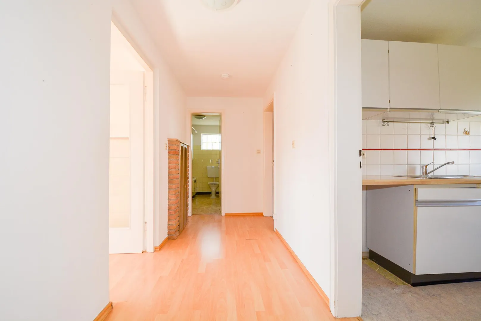 Im Flur und in den Zimmern ist Laminatboden verlegt. Im Badezimmer befindet sich ein Fliesenboden. Der Boden in der Küche ist mit Linoleum ausgestattet.