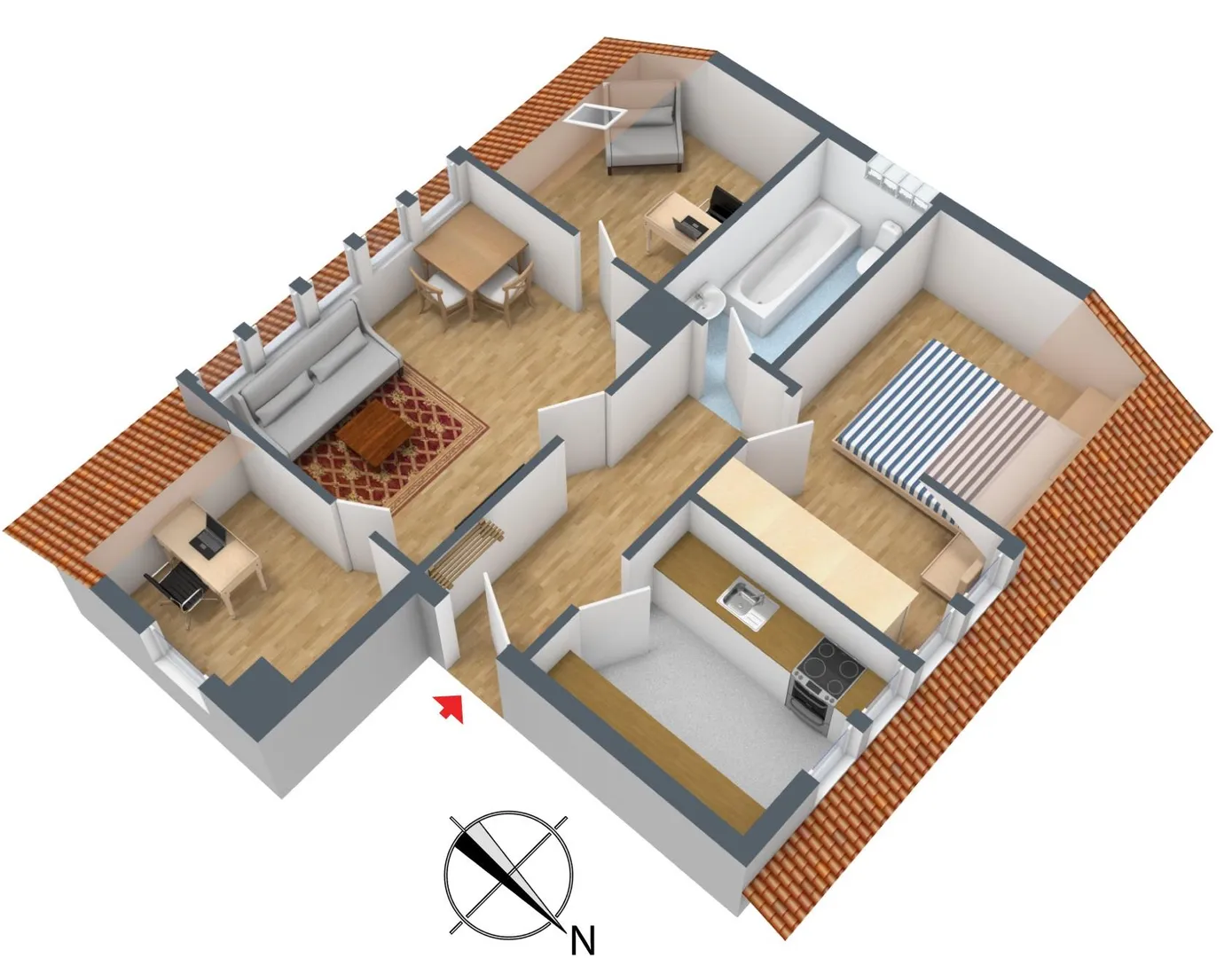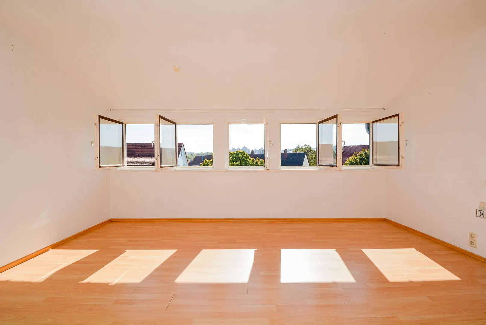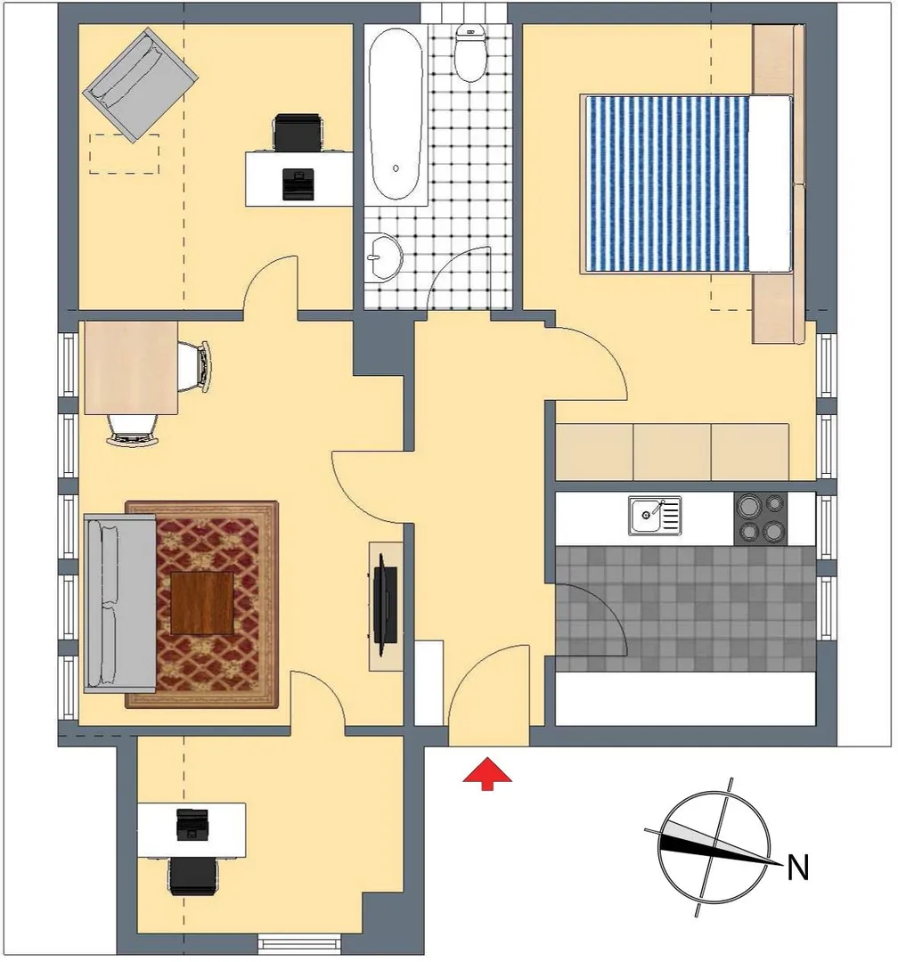 Das Wohnzimmer und ein Arbeitszimmer sind nach Süden ausgerichtet. Das zweite Arbeitszimmer ist nach Osten ausgerichtet. Das Schlafzimmer sowie die Küche sind nach Norden ausgerichtet.