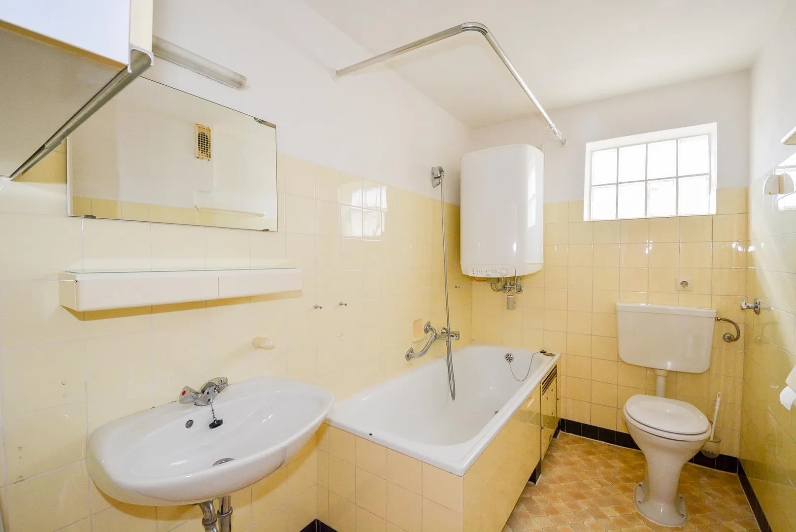 Das ¾ hoch geflieste Tageslicht-Badezimmer ist mit einer Badewanne, einem WC sowie einem Waschbecken ausgestattet.