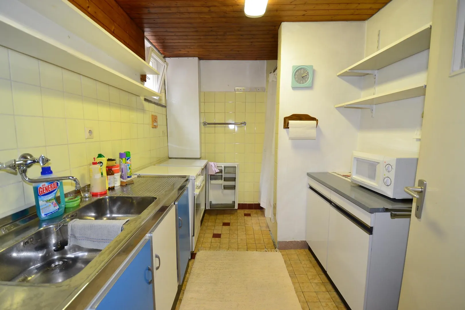 Die Küche ist mit einer Einbauküche, einer Dusche und einem Waschbecken ausgestattet. Die Einbauküche verfügt über einen Herd mit Backofen, einem Kühlschrank mit Gefrierfach, eine Mikrowelle sowie Unterschränke.