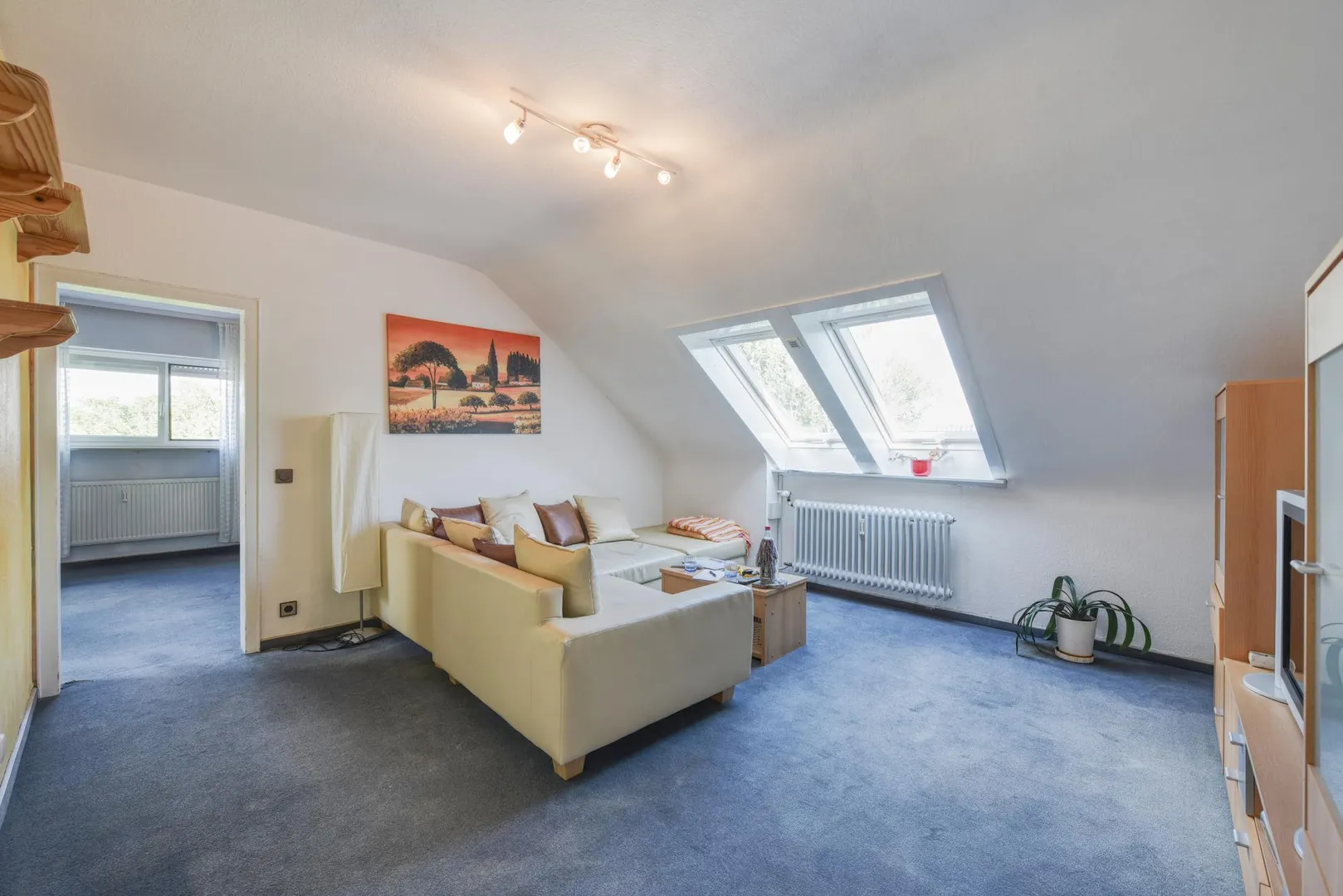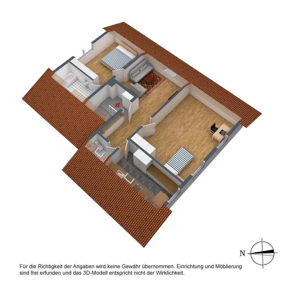 Diese möblierte und großzügige 3-Zimmer-Dachgeschoss-Etagen-Wohnung, für mindestens 2 Jahre und maximal bis 31.12.2024, befindet sich im 2. Obergeschoss.