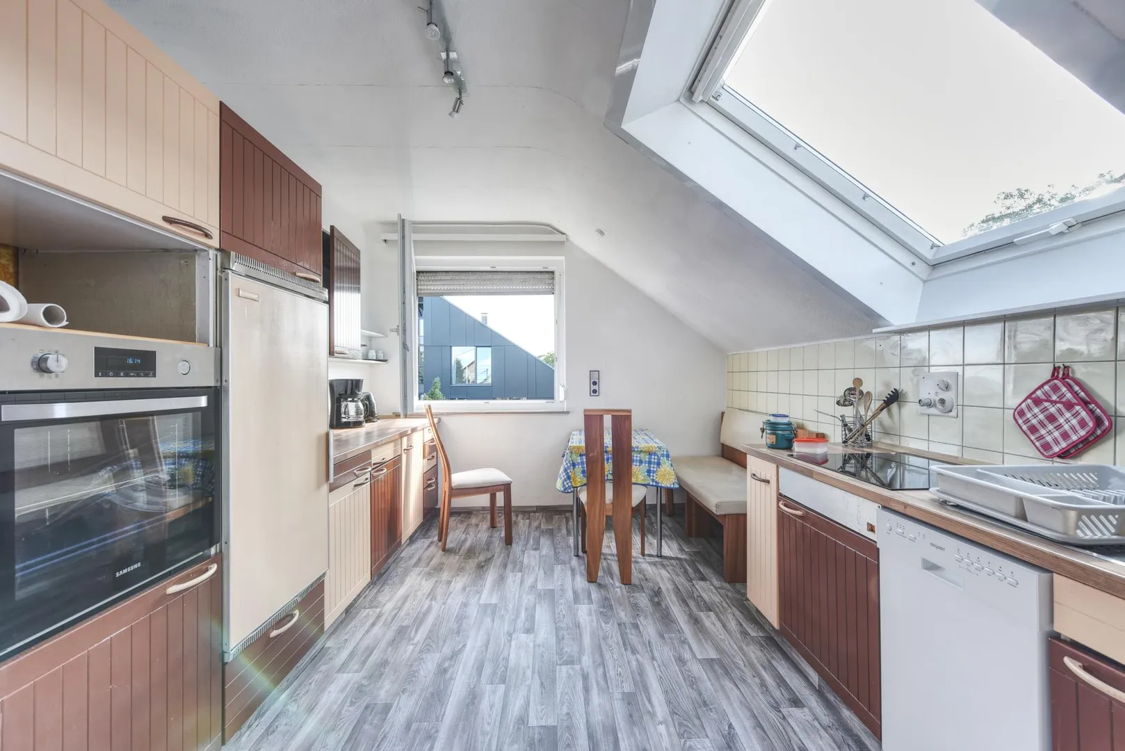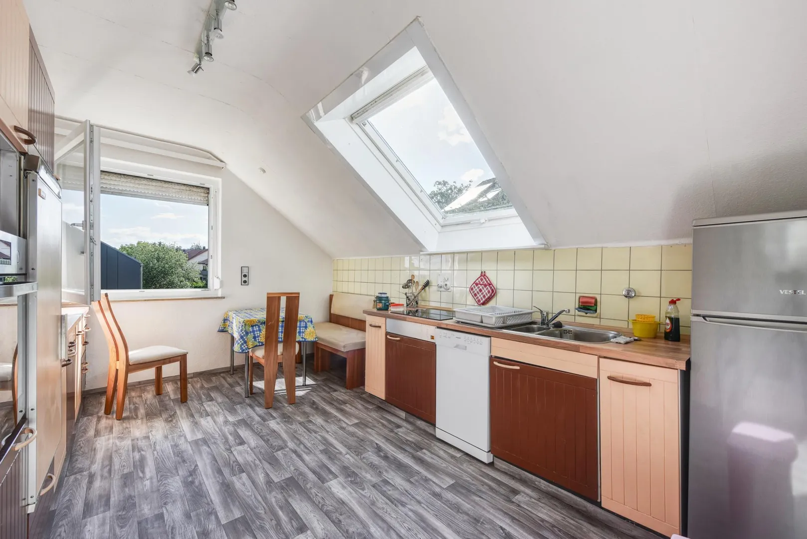 Diese möblierte und großzügige 3-Zimmer-Dachgeschoss-Etagen-Wohnung, für mindestens 2 Jahre und maximal bis 31.12.2024, befindet sich im 2. Obergeschoss eines 4-Familien-Hauses.