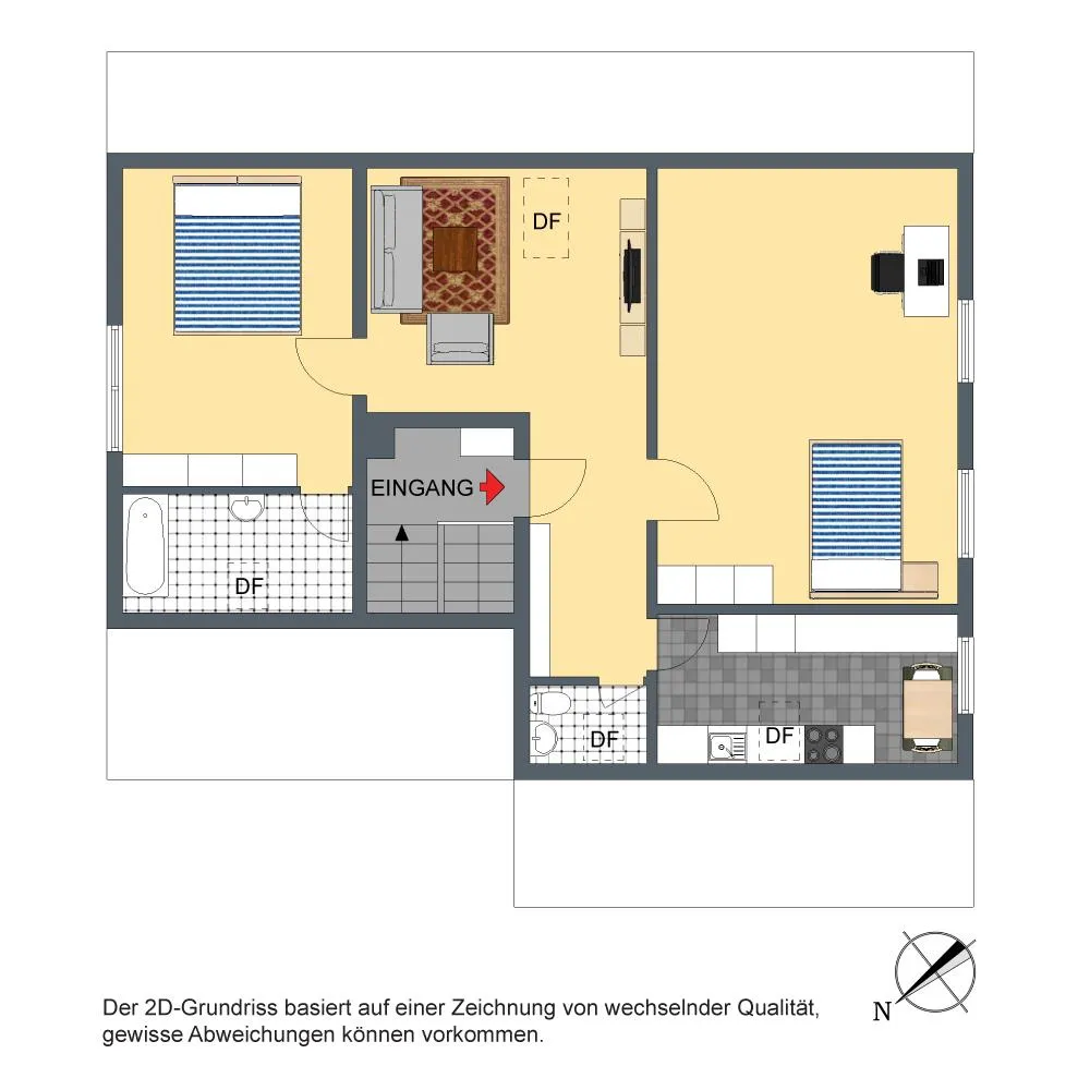 Die Böden im Flur und in den Zimmer sind mit Teppichböden ausgestattet. Die Böden im Badezimmer, in der Küche sowie im separaten WC sind mit PVC-Böden ausgestattet.