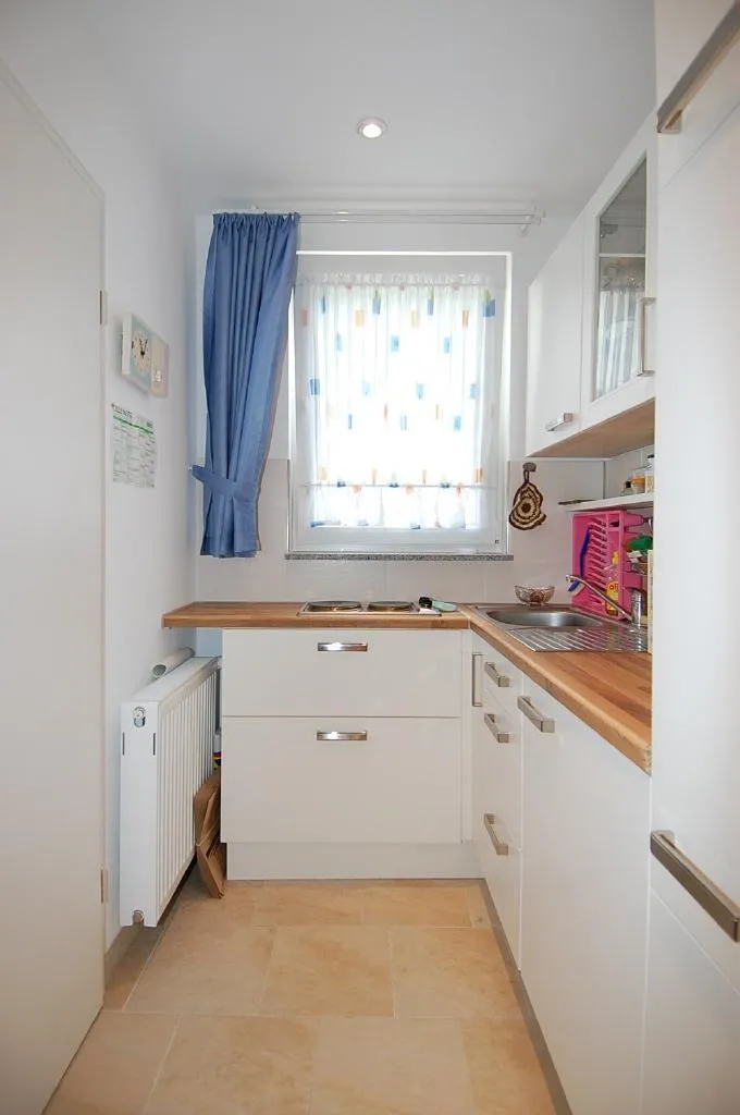 Die offene Küche ist mit einer neuwertigen EBK und Fliesenboden ausgestattet. Zur EBK gehört ein Kühlschrank und ein Kochfeld mit zwei Platten. Ein Backofen und eine Spülmaschine sind nicht vorhanden.