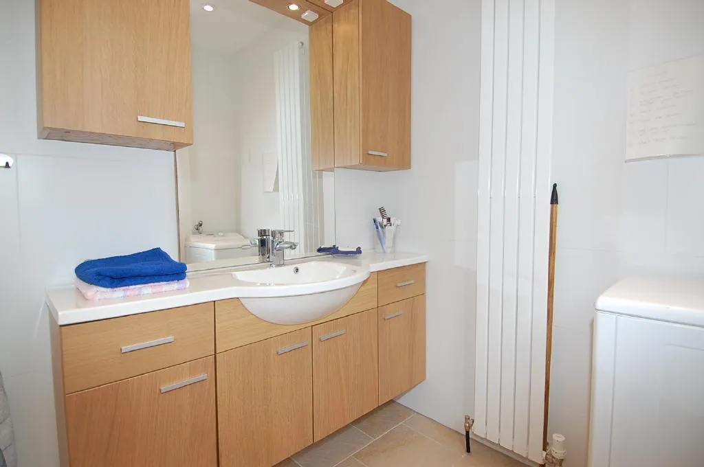 Das Tageslichtbad ist raumhoch gefliest. Es verfügt über einen Fliesenboden, eine bodentiefe Dusche, einen Waschbeckenspiegelschrank und einen Waschmaschinenanschluss mit Kombi-Waschmaschine und Trockner.