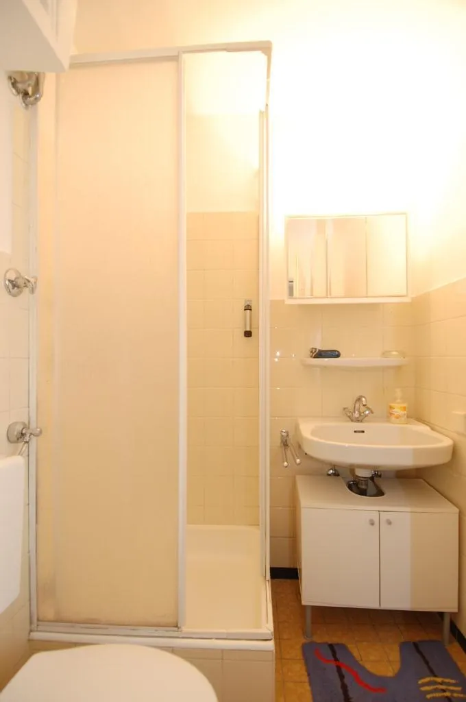 Das Bad ist halbhoch gefliest und ist mit einem Waschbecken, einer Dusche und einem WC ausgestattet.