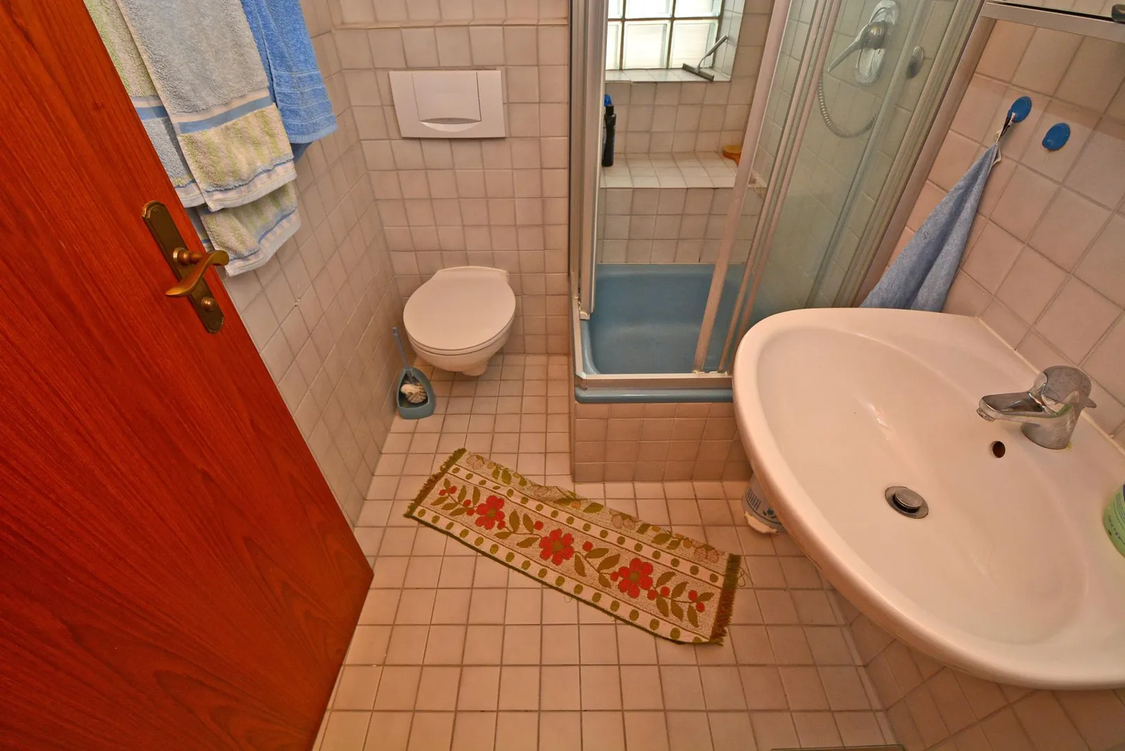 Das raumhoch geflieste Tageslicht-Badezimmer ist mit einer Dusche, einem WC, einem Elektro-Radiator sowie einem Spiegelschrank ausgestattet.