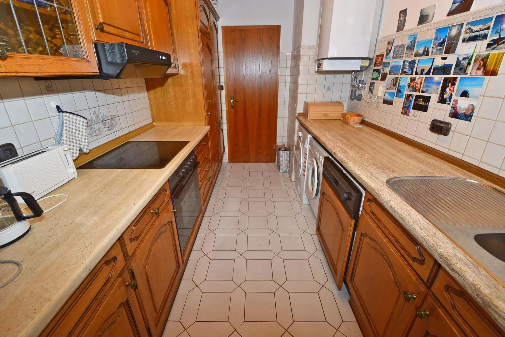 Die Küche ist mit einer älteren Einbauküche ausgestattet. Die Einbauküche beinhaltet einen Kühlschrank mit Gefrierfach, eine Spülmaschine, einen Herd mit Backofen und Dunstabzug nach außen, eine Waschmaschine, einen Trockner sowie Ober- und Unterschränke.