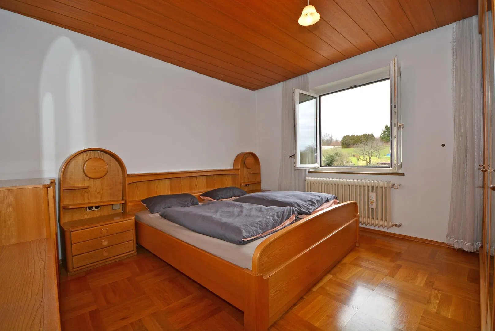 Im Schlafzimmer befindet sich Parkettboden. Die Böden in den restlichen Räumen sind gefliest.