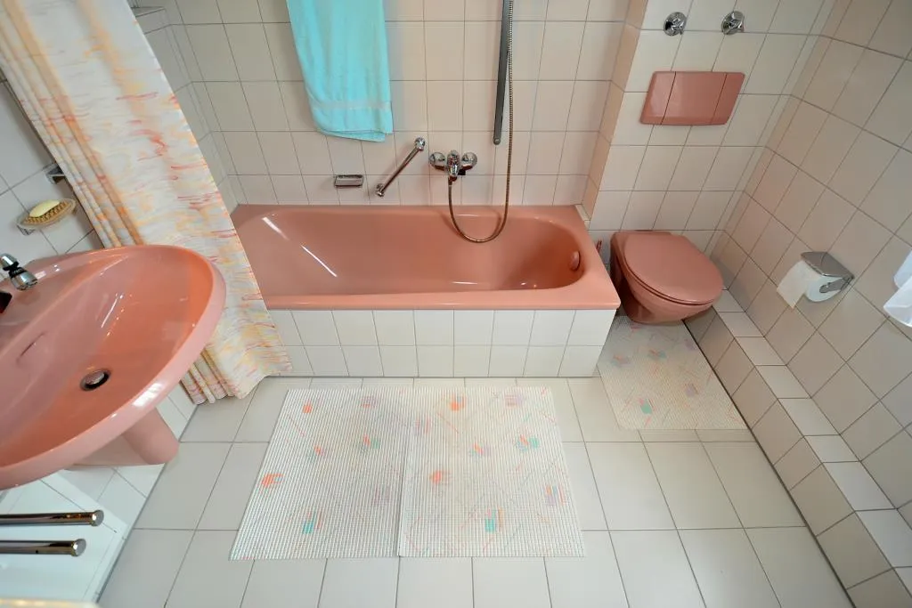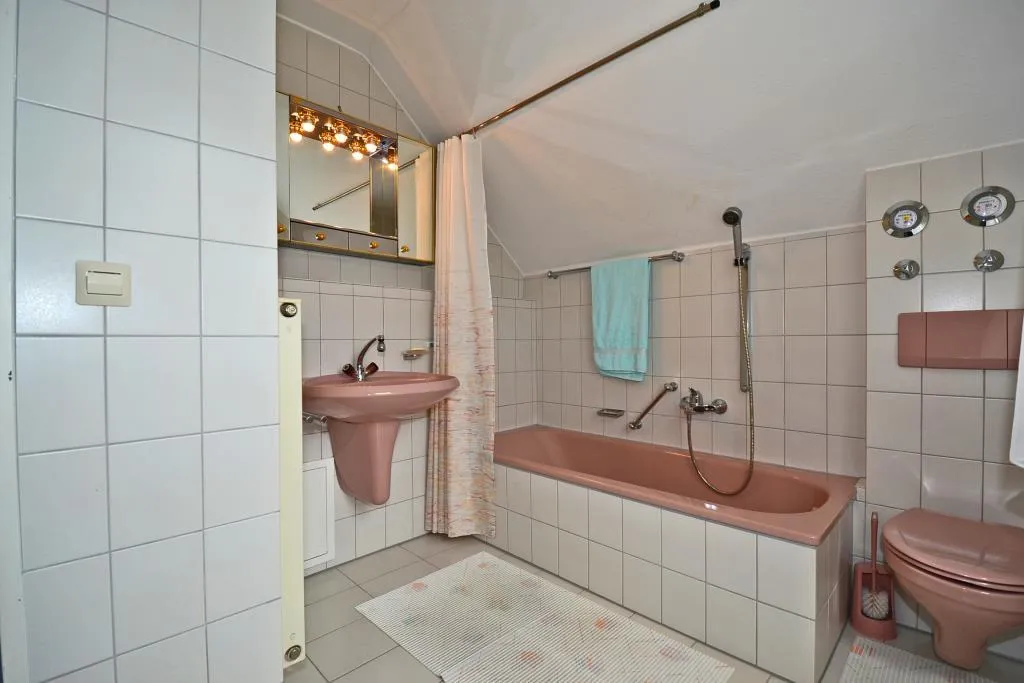 Das raumhoch geflieste Tageslicht-Badezimmer ist ausgestattet mit einer Badewanne, einem WC, einem Spiegelschrank sowie einem Waschmaschinenanschluss.