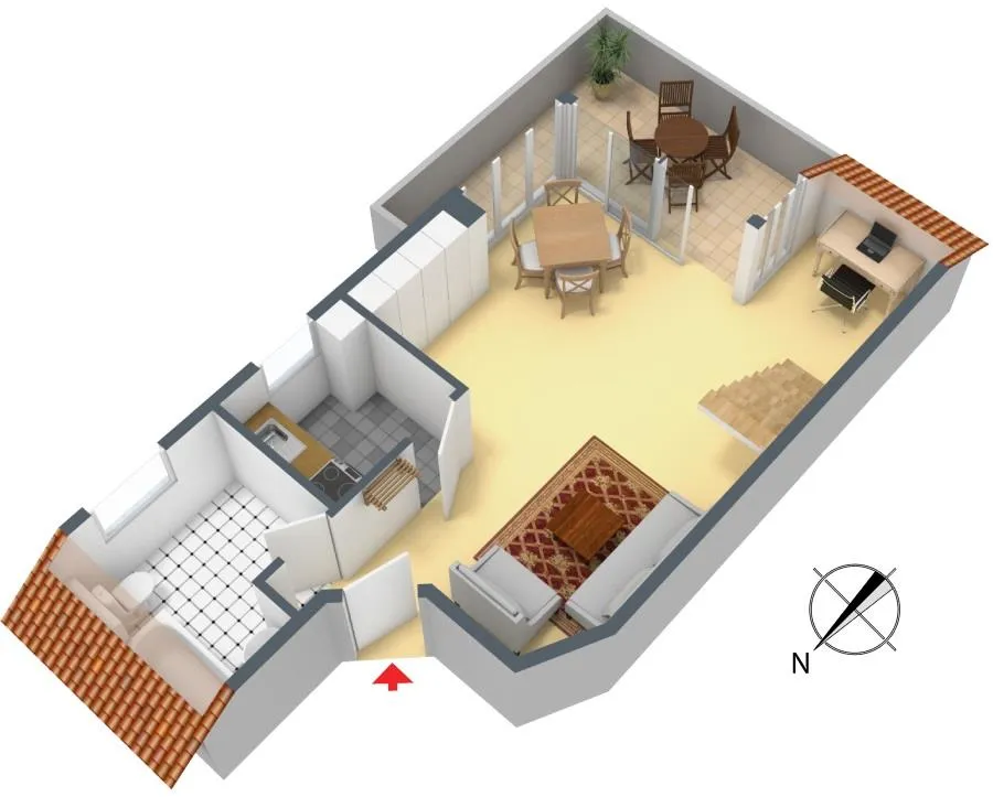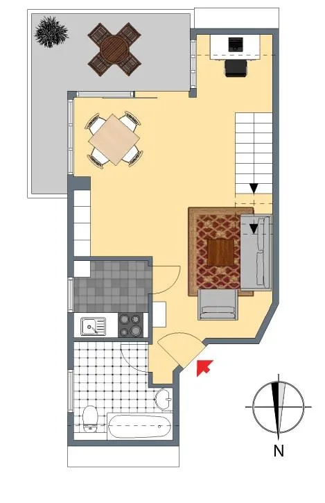 Die Wohnung ist offen geschnitten. Der Wohnbereich ist offen, das Schlafzimmer befindet sich auf der Galerie und ist somit zum Wohnbereich hin offen.