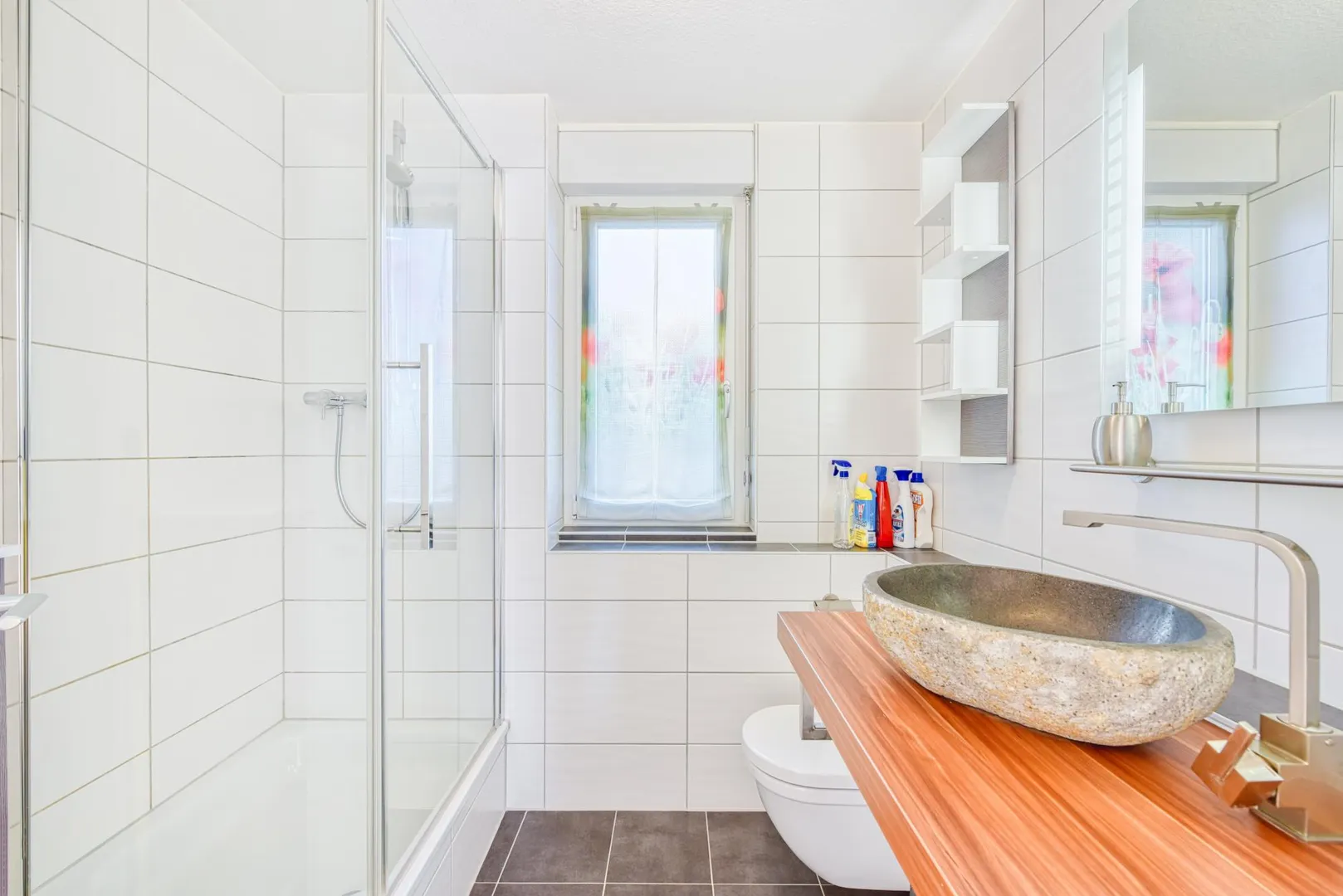 Das raumhoch geflieste Tageslicht-Badezimmer ist ausgestattet mit einer Dusche, einem WC, einem Handtuch-Heizkörper, einem Waschtisch mit Design-Waschbecken, einem Spiegel mit Konsole und einem Hängeregal.
